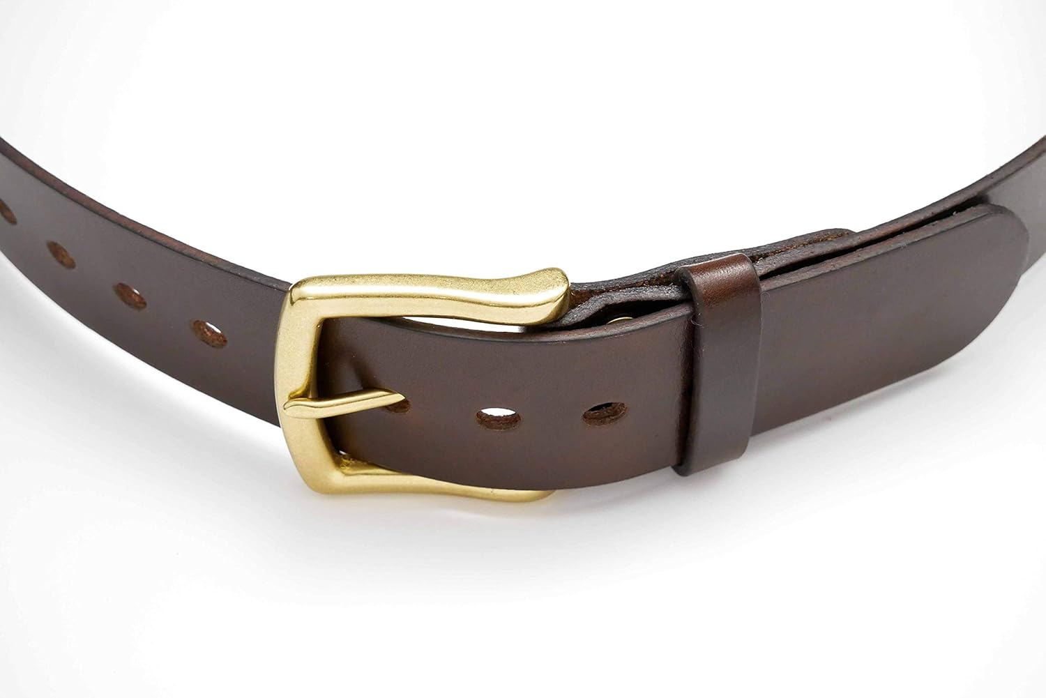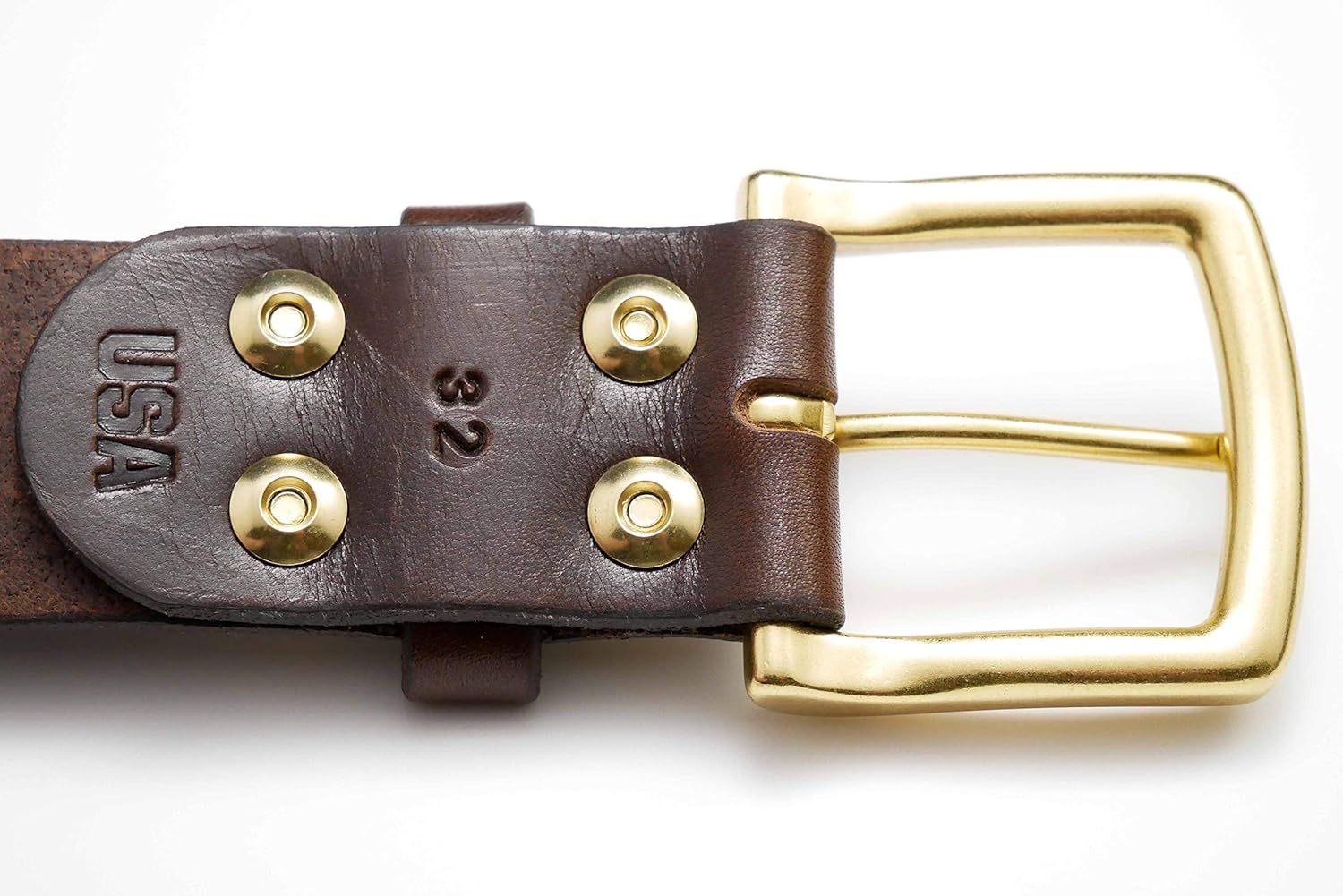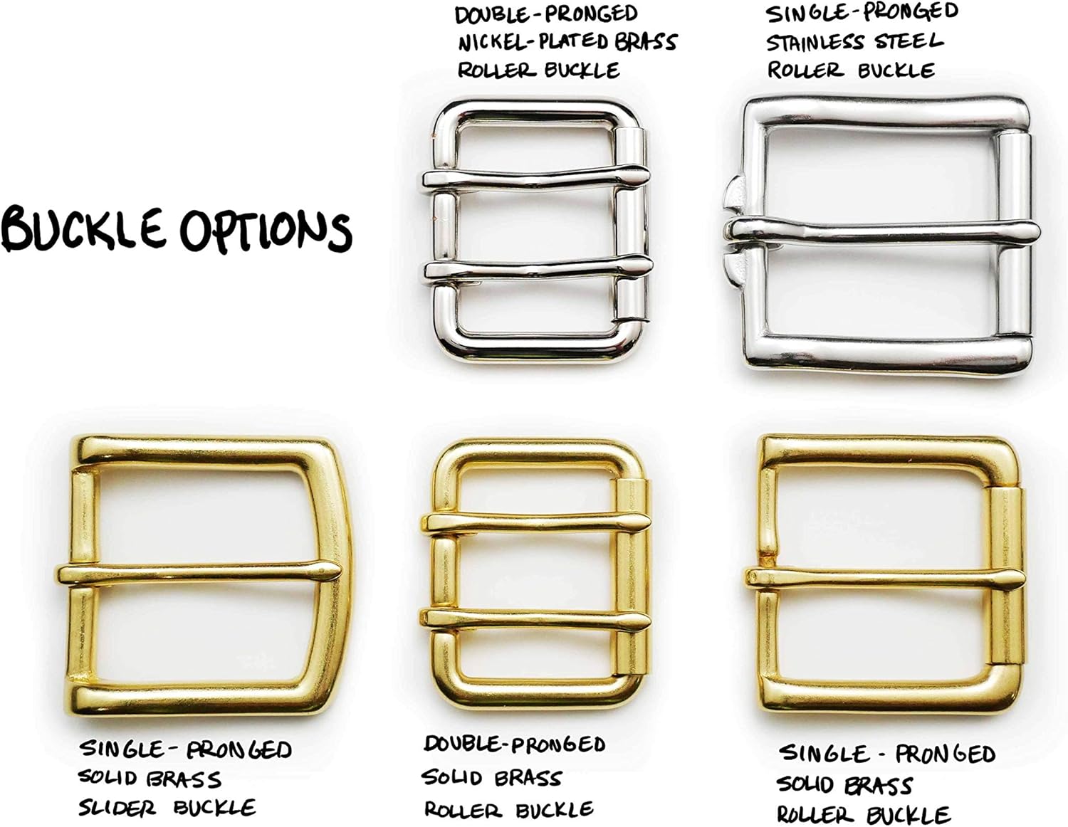 This thick full grain leather belt is built to last a lifetime. Each belt strap is cut directly from prepared cowhides. The edges are then hand burnished and painted giving the belt a clean finished edge. The holes in the single prong belts are oblong to prevent the leather from stretching. Four Chicago screws are set to hold our solid brass or stainless steel roller or slider buckle and matching leather keeper in place. Each belt features 9 holes which are set in 3/4″ intervals for fine adjustment. Single and double prong options are available as seen in the images. We recommend pairing the brass with the brown colors and the stainless steel with the black for aesthetic purposes. Wear it with your most comfortable jeans or a nice pair of khakis! All belts are backed with a Lifetime Warranty and a 100% Satisfaction Guarantee (you may return for a refund if you do not like it within 7 days of receiving it). Sizing (MUST READ INFORMATION): We finish each belt for you when you place your order. When selecting a belt size, we recommend that you order your pant size , meaning if you wear size US 36″ waist jeans, select a size 36 belt. We automatically adjust the belt to fit you and will attempt to make the belt fit you on the center hole, but it is okay if it varies on either size of that. We are offering sizes 28-48, but if you need a size outside of those, please contact us. We have paired the brass buckles with the brown leathers and the stainless steel/nickel buckles with the black leather as we think this looks best. If you want something outside of these options, please email first. NOTE: the light brown leather belts are a very limited edition, never to be available again after we sell out, therefore their price is much higher (we only have about 20-30 of them to offer). We guarantee that our belts will not have any manufacturer defects and will also allow for a lifetime warranty if the leather rips, the buckle breaks, or the hardware comes out.