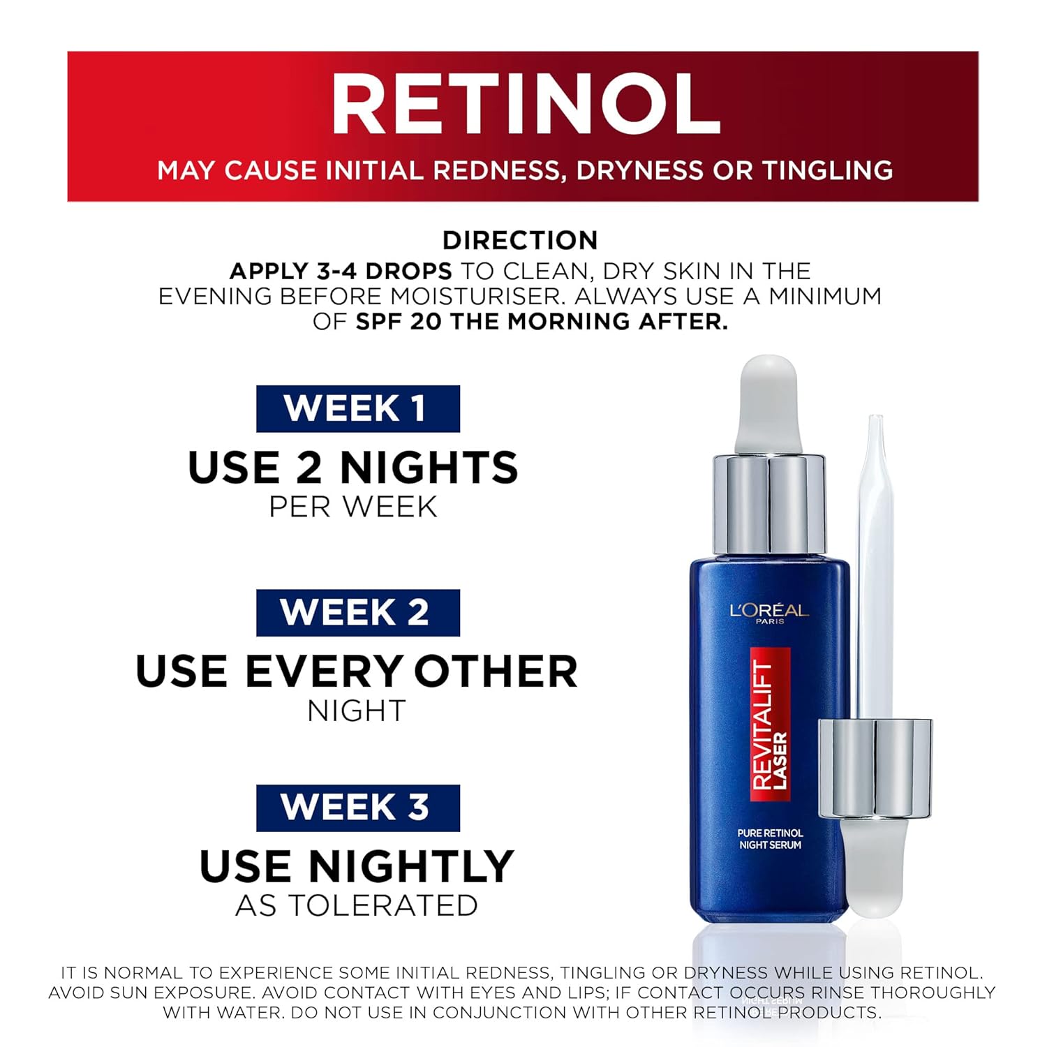This product is a great moisturizer for dry skin."}. {"description": "L'Oreal Paris Revitalift Laser Pure Retinol Night Serum 30ml is a serum designed to combat aging signs such as wrinkles, age spots, loss of firmness, and uneven texture. With Retinol in its formula, it stimulates the skin's natural renewal process, boosts collagen production, and evens out the complexion. Additionally, it's infused with Hyaluronic Acid, which not only hydrates the skin but also plumps it up. Lastly, Vitamin E acts as a potent antioxidant, shielding the skin from oxidative stress and free radicals. In essence, this serum's unique formula refines and renews the complexion, smoothing the skin's surface and revealing a brighter, more youthful appearance.