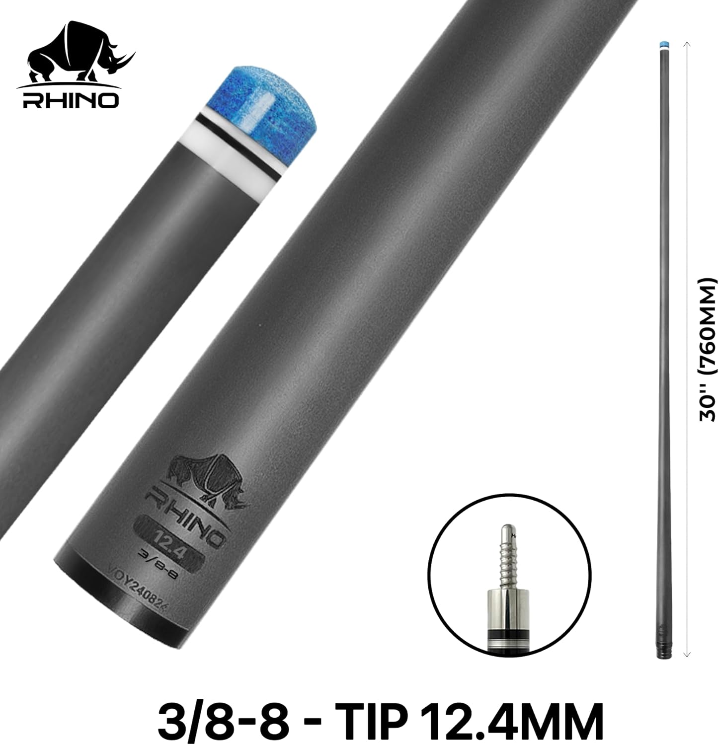 Rhino Carbon cue shaft is designed and developed by incorporating superior advantages of carbon composite material and unique low deflection technology to deliver exceptional stroke. RHINO CARBON FIBER POOL CUE SHAFT’s SPECIFICATIONS: Currently, Rhino Carbon Fiber Pool Cue Shaft’s length is 30’’ (~760 mm) which is perfect fit with butt’s joint collar in 21.5 mm. Thin white 0.157” inch high strength and durability ferrule. 8 Layered High-Performance Rhino Tip. Pro taper. Wide range of tip diameter from 11.8mm to 12.9mm.