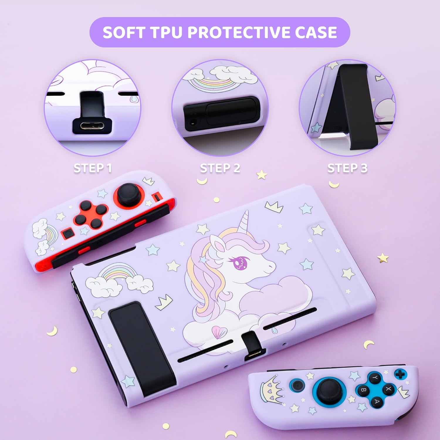Full of kawaii cute for unicorn carrying case for Nintendo SwitchLightweight and large storage space for your daily or travel useAmple storage spaceZippered mesh pocket can hold charging cables, spare joycon, earphones, and other small accessories, and keep items from falling.10 game card slots allow you to take your favorite games with you wherever you go. straps and easy-to-remove drawcords for switch, convenient for your use.Safe storage environmentHard EVA bag is waterproof and wear-resistant, isolates oil stains.Interior is covered with fluff to absorb shock in the event of an accidental drop.[ Protective Case: Installation Steps & Fixing Points ]Step 1: press the fixing points at both endsStep 2: press the fixed point on the back charging portPress them to fix them in place, then the protective case will not shake or fall off easilyMatching accessories set✔ Same theme protective shell for switch oled, soft TPU material to isolate collision, scratch damage✔ Two cute thumb caps provide comfortable feel✔ 9H Hardness HD screen protector, Fast Response and Reliable Screen Protection✔ Adjustable shoulder strap, provide a variety of travel carrying methodWe are a store dedicated to providing game accessories for switch game enthusiasts, and we are committed to providing you with professional products and services.
