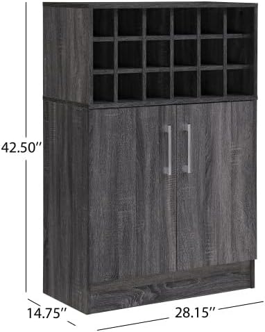 The ultimate wine cabinet, with room for 18 bottles up above and all the glasses you need down below. Built with the highest quality materials and to exacting specifications to ensure a fine quality of craftsmanship. A piece for a true connoisseur. Product Details Includes: One (1) Cabinet Material: Faux Wood with Faux Wood Overlay Finish available in: Sonoma Gray Oak or Wenge Assembly Required Dimensions: 14.75"D x 28.15"W x 42.50"H