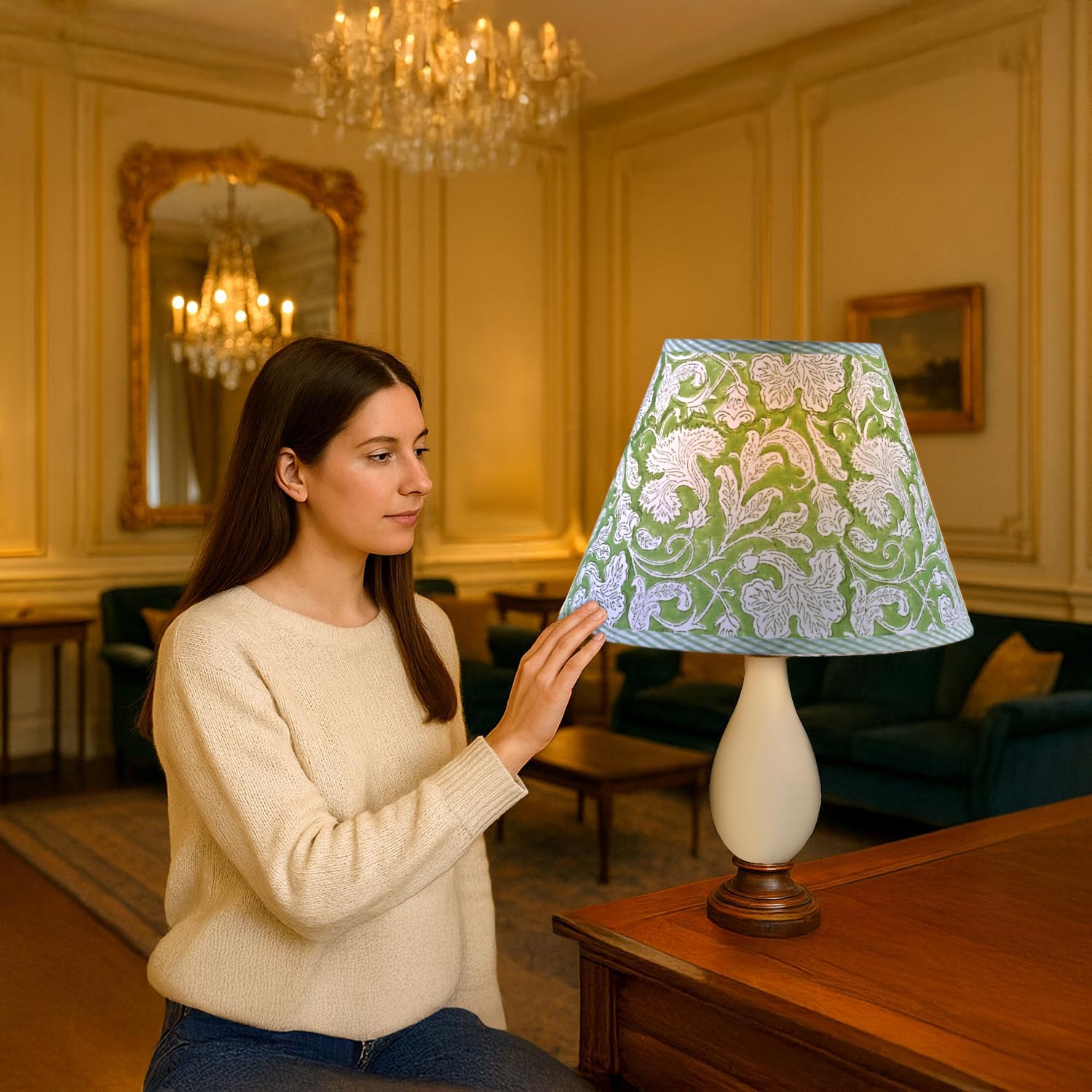 Bring artisan elegance to your home with our Ridhi Hand Block Print Hardback Floral Lamp Shade, beautifully crafted to add warmth and charm to any room. Each lampshade features an intricate floral pattern created using traditional hand block printing techniques, making every piece visually rich and uniquely detailed. Designed in a versatile 7" top x 13" bottom x 10" slant size, this shade fits most table and floor lamps with its classic harp and finial fitting. The hardback structure ensures durability while providing a soft, diffused glow—perfect for creating a cozy, inviting ambiance in bedrooms, living rooms, reading corners, or study areas.Available in soothing and earthy color tones, this lampshade complements a variety of boho, natural, modern, and traditional décor styles. It also makes a thoughtful gift for Christmas, Thanksgiving, housewarmings, or any special occasion for home décor lovers.