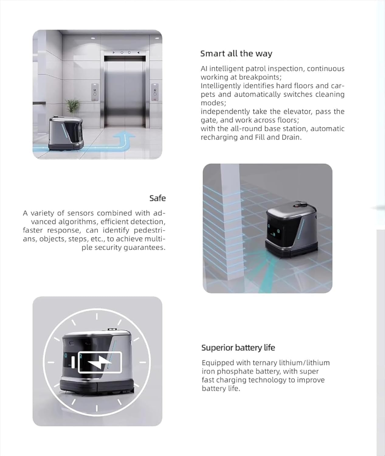Each robot integrates navigation systems, multiple intelligent sensors, and a stable, reliable performance core, designed to seamlessly integrate into diverse environments such as restaurants, hotels, offices, shopping centres, residential buildings, and industrial sites.1. Integrates multiple functions including sweeping, scrubbing, dust mopping, and vacuuming; features a modular design for quick replacement of cleaning components.2. Two core modes: a. Sweeping, vacuuming, and mopping: side brushes + roller brush sweeping, vacuuming, and dust mopping; b. Floor scrubbing: roller brush scrubbing + water suction.3. Supports multi-robot scheduling, automatic repositioning, and multi-robot to multi-station functionality.4. Intelligent IOT system, automatically navigates through elevators, turnstiles, and access control systems.5. Intelligent cloud platform for real-time monitoring of the cleaning process and results.