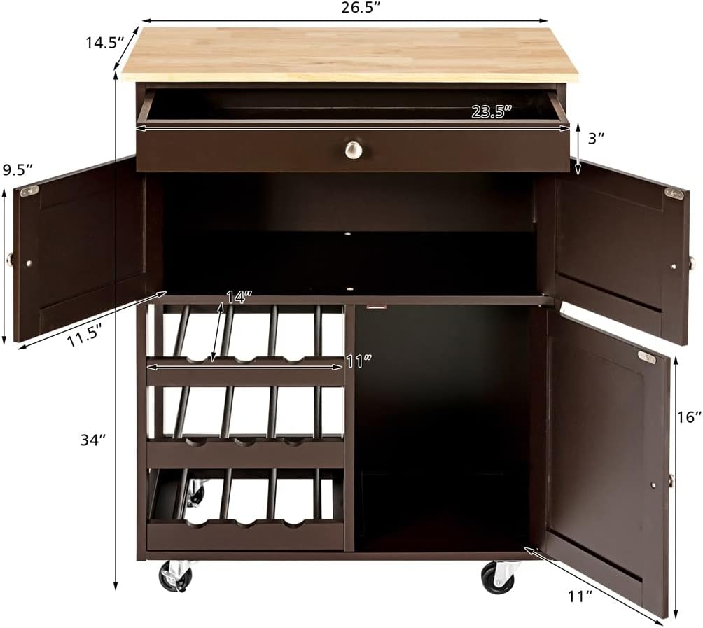 Crafted with MDF material and rubber wood for durable and long-time use Swivel casters allow you to easily move the kitchen cart anywhere ,Two lockable casters with brakes for you to keep the cart in position Designed a drawer, 3 tier wine rack and 2 cabinets for versatile storage Wide application in the kitchen, restaurant, living room and bar Natural rubber wood tabletop has a great weight capacity of 66 lbs 3-tier wine rack keeps different wines in great order Material: Rubber Wood, MDF Product Dimensions: 26.5" X 14.5" X 34" (L x W x H) Tabletop Weight Capacity: 66 lbs Drawer Weight Capacity: 17.5 lbs Shelf Weight Capacity: 44 lb Net Weight: 40 lbs Package Includes: 1 X Kitchen Cart 1 X Instruction (Other demonstration items not included). matters need attention: 1. Please allow a 2-3% error due to manual measurement, and make sure you don't mind before you bid. 2. Color may vary by display, please refer to the actual product.