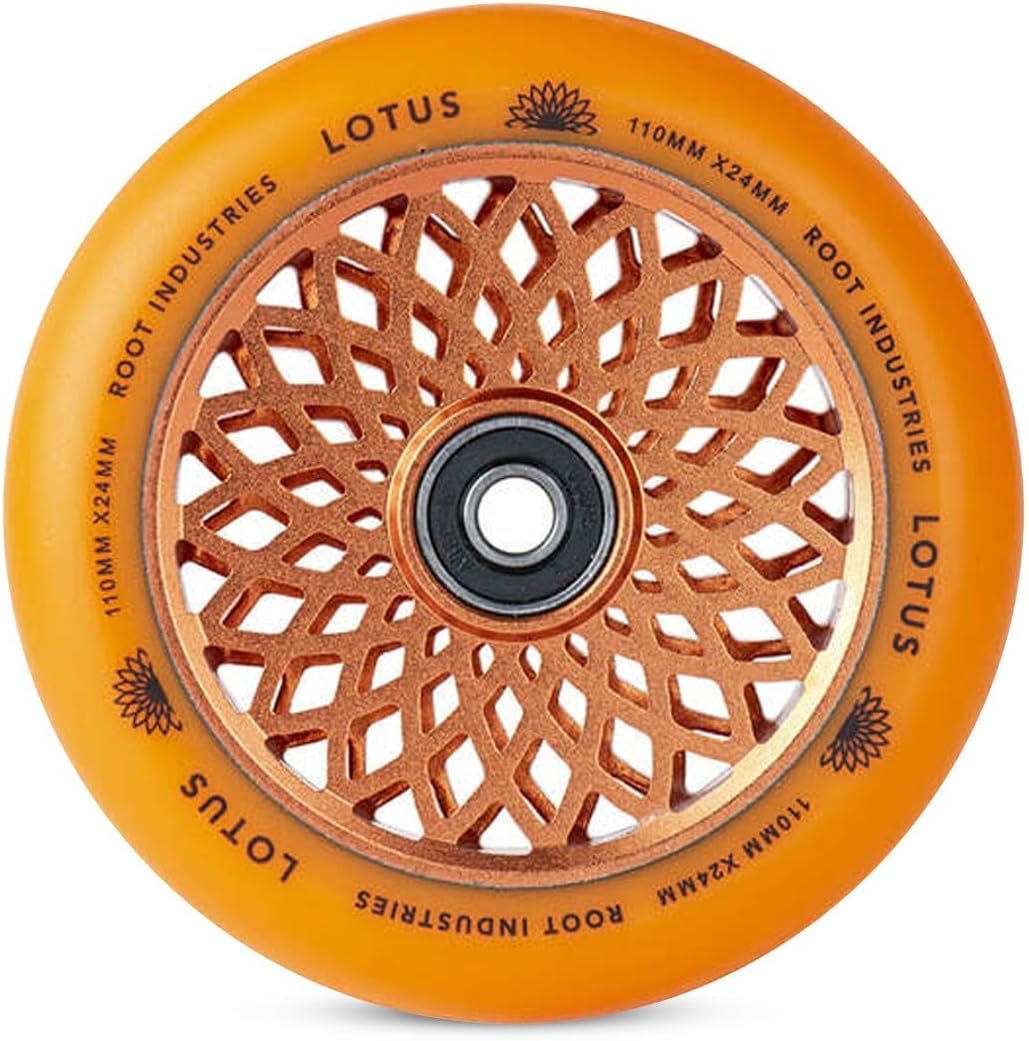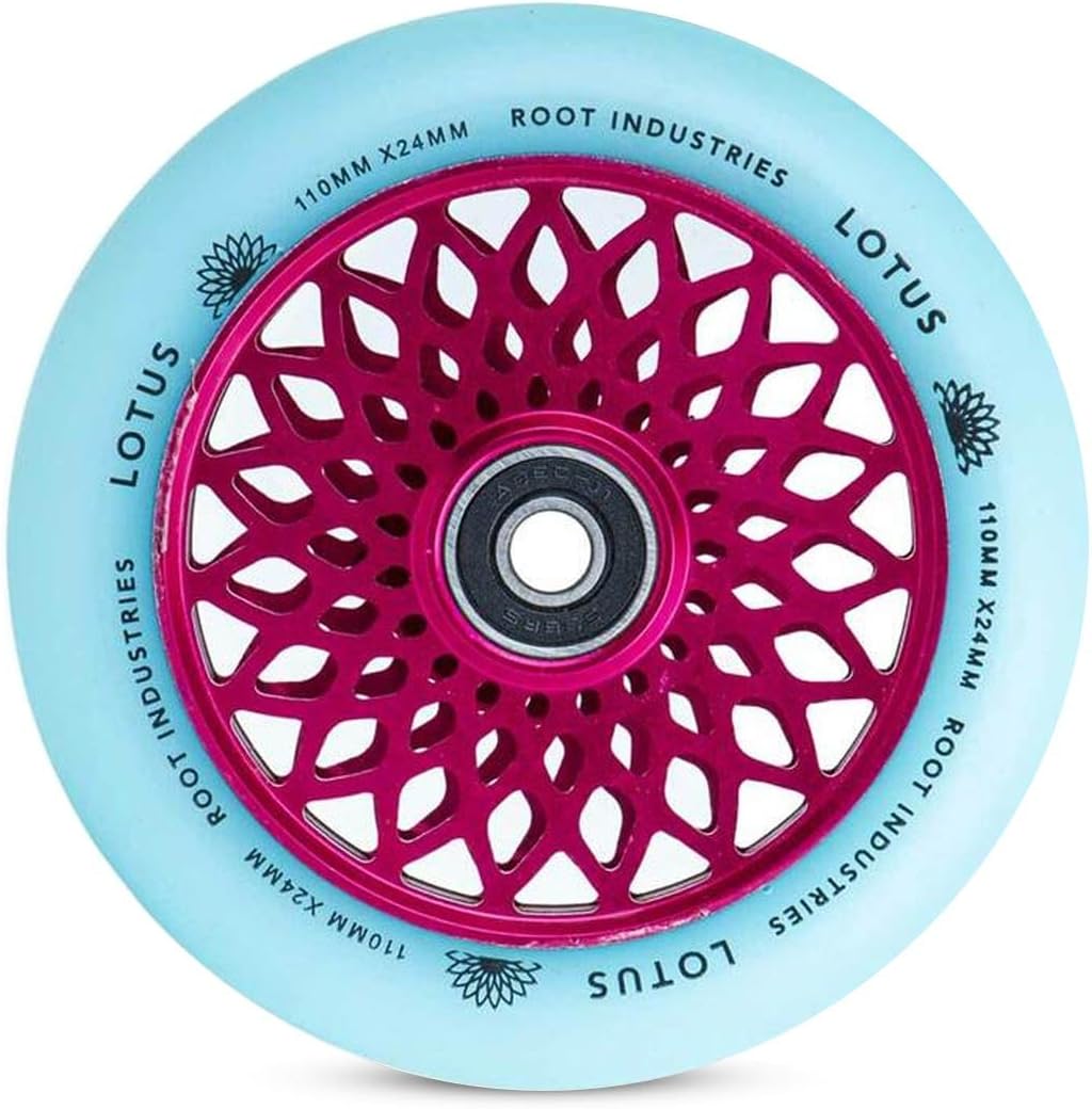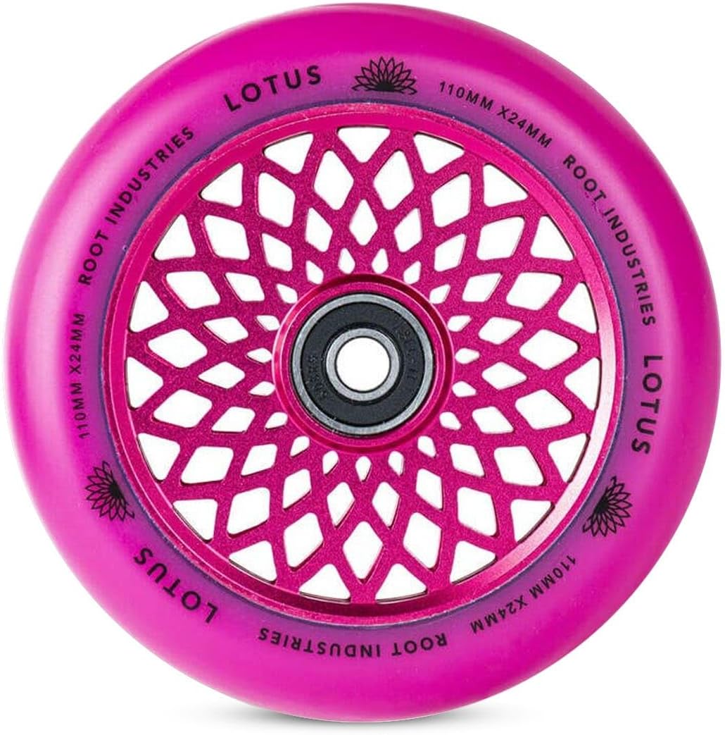 The Lotus wheels are take on a fresh look and size for the New Year, coming in at 110mm x 24mm! The all around width of 24mm will allow riders with practically any fork or deck to ride these wheels. The Lotus wheels come with Root's signature quality, so these are bound to exceed your expectations of what a good wheel is. Size: 110mm Core Width: 24mm Urethane Width: 24mm Core Material: Aluminum Urethane Rating: 88a Bearings included: Yes Sold as: Pairs