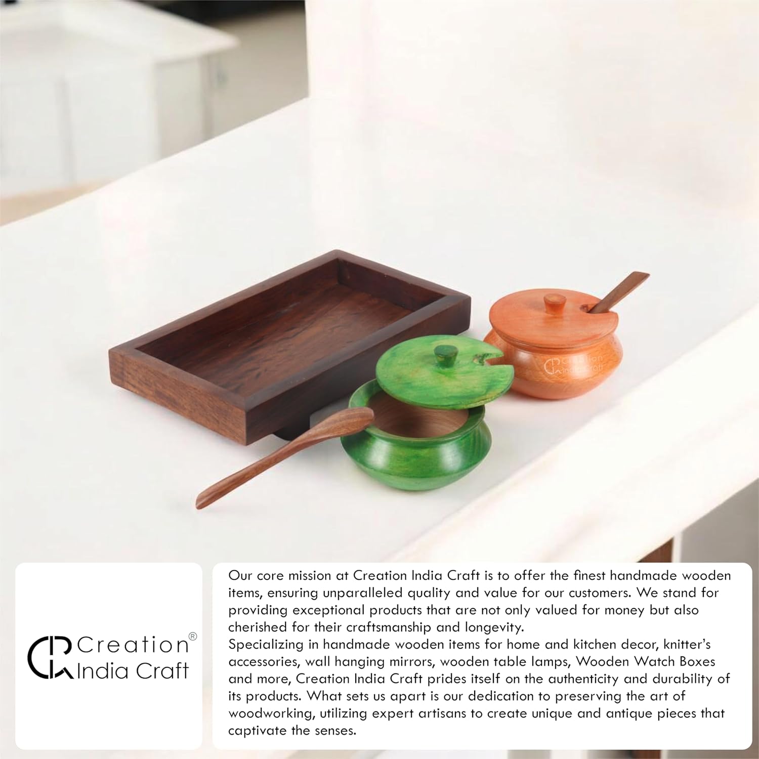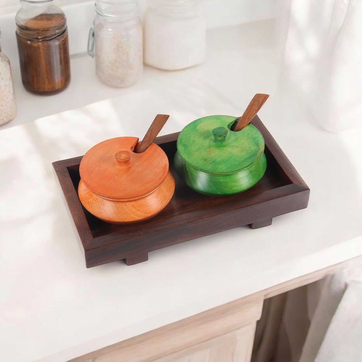 Color: Brown, Material: Wood . This Beachwood jar set with tray in Sheesham Wood is ideal for serving sauf, cardamom etc. after lunch/dinner to your guest. The spoon and the bowl has been crafted in a unique shape. It comes with a jar cover to cover the bowl. Alternatively in the festive season this product can also be used to store 2 different types of spices as well, Handcrafted. Comes with 2 jars with lids, 2 spoons and 1 tray. Craetion India Craft . Jar Set With Tray & Spoon, This Beachwood multicoloured jars set with tray is ideal for serving sauf, cardamom etc after lunch/dinner to your guest. The spoon and the bowl has been crafted in a unique shape. It comes with a jar cover to cover the bowl.Dimensions :TOTAL: (L x W x H) = (7.6 x 4.3 x 2.5), TRAY: (L x W x H) = (7.6 * 4.2 * 1.4), JAR: (H * DIA) = (2.2 * 3) InchTRAY :Length - 7.6 inch (19.30 cm)Width - 4.3 inch (10.92 cm)Height - 2.5 inch (6.35 cm)Jar :Handi Diameter - 3.2 inch (8.12 cm)Height - 2.2 inch (5.58 cm)Volume of Multicolor Jars - 60mlA PERFECT GIFT :It is a Best Gift for Marriage Anniversary , Parents , Mothers day , Wedding Return Gift , Birthday , House warming ,christmas, holidays , Office / Shop Inauguration , Festive occasions - Like Diwali ,Raksha Bandhan , Grah pravesh and Corporate Gifs.Package Contents: 2-Piece Jars , 2-Piece Lids, 2-Piece Spoons, 1-Piece Tray.