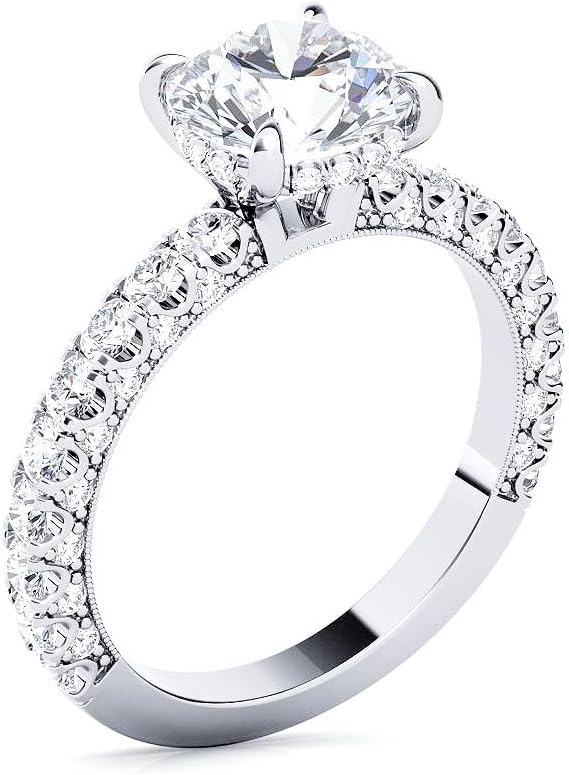 Elevate your proposal with this exquisite Round Cut Diamond Engagement Ring set in lustrous Platinum. Featuring a stunning 1.00 carat center diamond of near-colorless G color and VS2 clarity, this ring sparkles with brilliance from every angle. The total diamond weight of 2.00 carats includes meticulously placed accent stones that enhance the center gem's radiance. Each diamond is 100% natural and genuine, with the center stone's quality verified by GIA Certification. The timeless round brilliant cut maximizes light reflection, creating exceptional fire and brilliance. Available in various center sizes, colors, and clarities to suit your preference, with a matching band option to complete the set. This ring represents not just a beautiful piece of jewelry, but a symbol of enduring commitment crafted with superior artisanship.