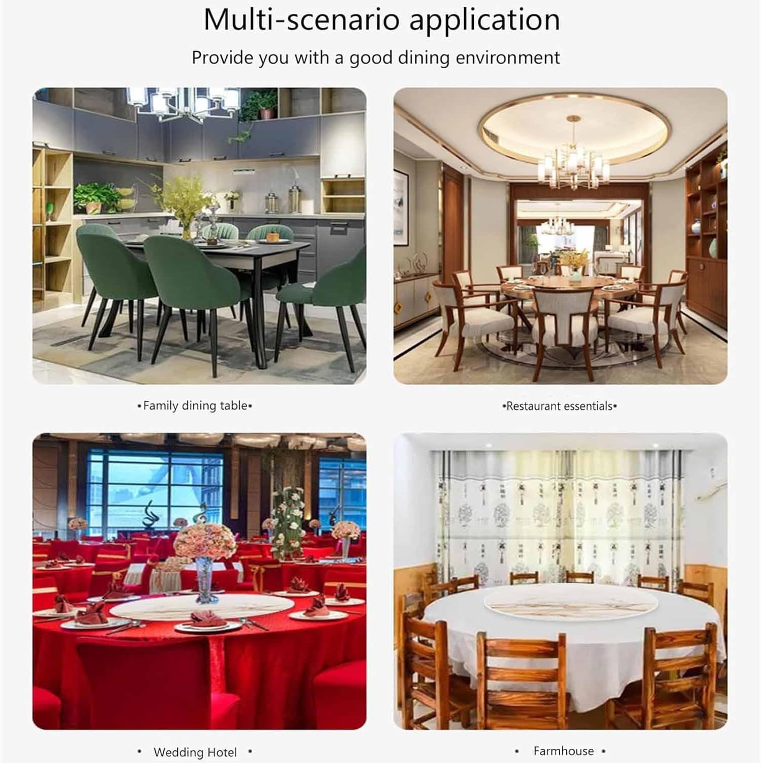 The lazy Susan Turntable surface is smooth and rotates smoothly by 360 degrees, allowing sharing food with family and creating a comfortable dining experience for easy rotation of 360 degreesProduct InformationName: Dining table turntableShape: CircularThickness: 12 mmMaterial: Rock slabColor: as shown in the pictureSize (reference for daily home turntable configuration):24 inches/60 cm in diameter (for 100 cm round table)Diameter 28 inches/70 cm (for round tables of 110-120 cm)Diameter 32 inches/80 cm (for round tables 120-130 cm)36 inches/90 cm in diameter (for round tables of 135-140 cm)40 inches/100 cm in diameter (for round tables of 140-150 cm)Multifunctional: Suitable for hotels, banquets, birthday parties, family gatherings and office meeting tables, etc.Package includes: 1* round turntableCharacteristics of rock board1. Even if it comes into direct contact with high-temperature objects, it will not deform2. It can be in contact with food directly3. Stains can be cleaned by wiping4. Anti-collision edge designKind tips:1. All products are measured manually, and errors of 1-2 cm may occur. Please refer to the actual products.2. Due to shooting angles, light, viewing angles, etc., slight errors and color differences are inevitably present. Thank you for your understanding3. Due to the special production process, no two turntables are exactly the same