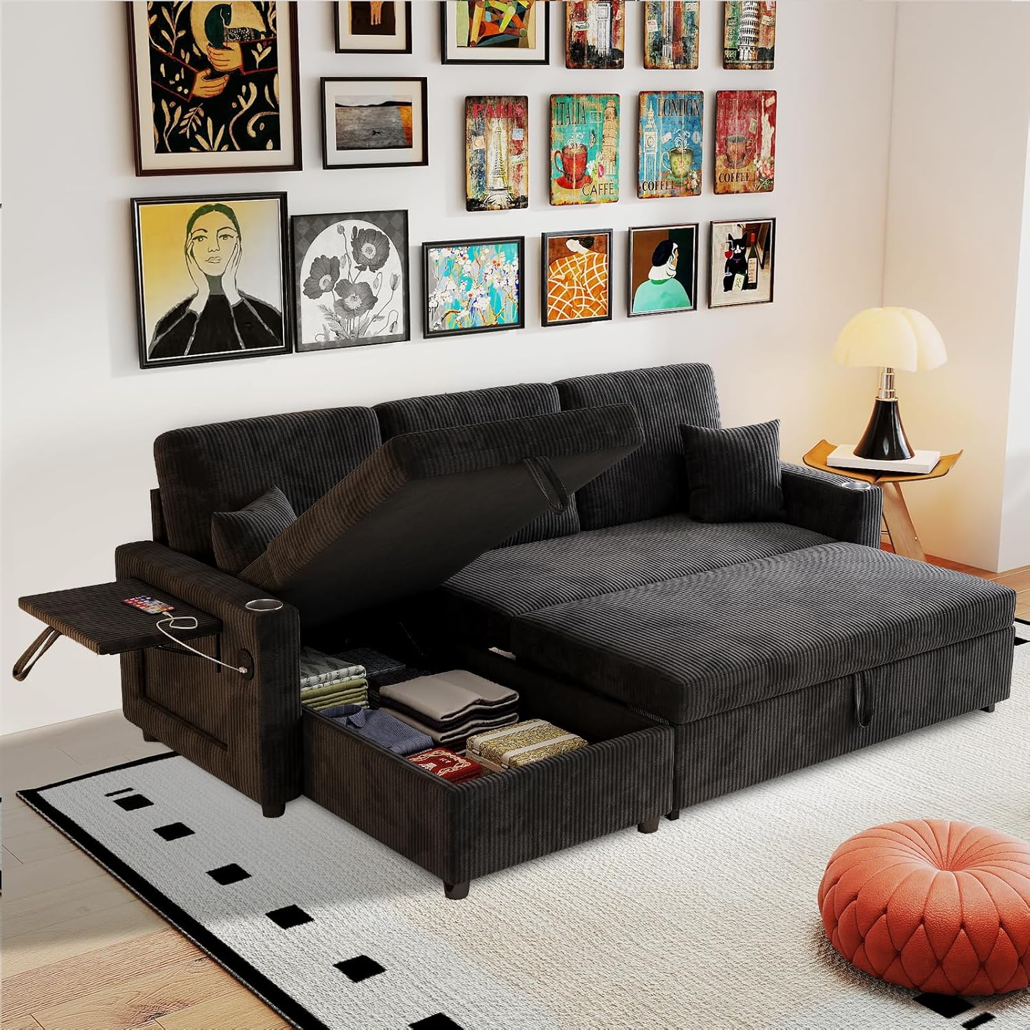 This convertible sofa bed combines seating, sleeping, and storage in one space-saving design. With a pull out couch function, L shaped sofa layout, and hidden storage, it fits apartments, dorms, and small living spaces.