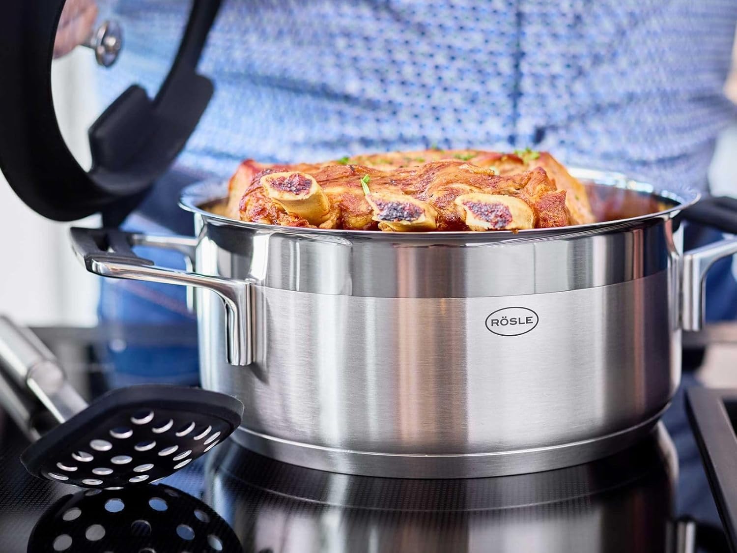 RÖSLE Silence Pro cooking pot 24 cm Silence Pro - the name says it. The further development of the popular Silence series leaves nothing to be desired. The main focus is on the pot lid, because it offers full comfort and everything a pot needs today. The silicone rim on the handles and lid glass not only protects against heat, but can replace the kitchen strainer with its pouring options. If the lid is reset in a controlled manner, larger amounts of liquid are quickly poured out. If the lid remains flush on the pot, you can drain fine products. And thanks to the thumb rests on the glass lid, everything without pot holders. In addition, there is no need to ask where to go with the lid when cooking - this can be easily fixed to the side handle. And even the condensate is collected. Simply superbly good. The most important thing at a glance: Universal pot for searing meat and for cooking dumplings, vegetables, pasta and soups. Made of high-quality 18/10 stainless steel, tempered glass and silicone. Silver and black. 2-tone polishing: matte with highly polished edge. Inner scaling. Encapsulated sandwich base with 5 mm aluminium core. Cooking pots with lid with lid. 555555 Lid temperature resistant up to 160 degrees C. Steam release thanks to the lid curvature, ideal steam extraction with integrated hob extractors. Dishwasher-safe. Suitable for the following types of cookers: electric, ceramic, gas, induction and oven. Product details: length: 34.5 cm, width: 25.5 cm, height: 19.1 cm, pot diameter: 24 cm, base diameter: 22.8 cm. 5. 8 litre brand description RÖSLE - innovative kitchen equipment from tradition. The family business RÖSLE - since 1888 - offers barbecue and kitchen equipment at the highest level. Our long tradition enables us to enrich the kitchen again and again with innovative ideas. Values such as optimal functionality, high quality and attractive design are timeless. We have committed ourselves to these values over the last 130 years. That's why we are the reliable partner for those who work with passion in the kitchen.