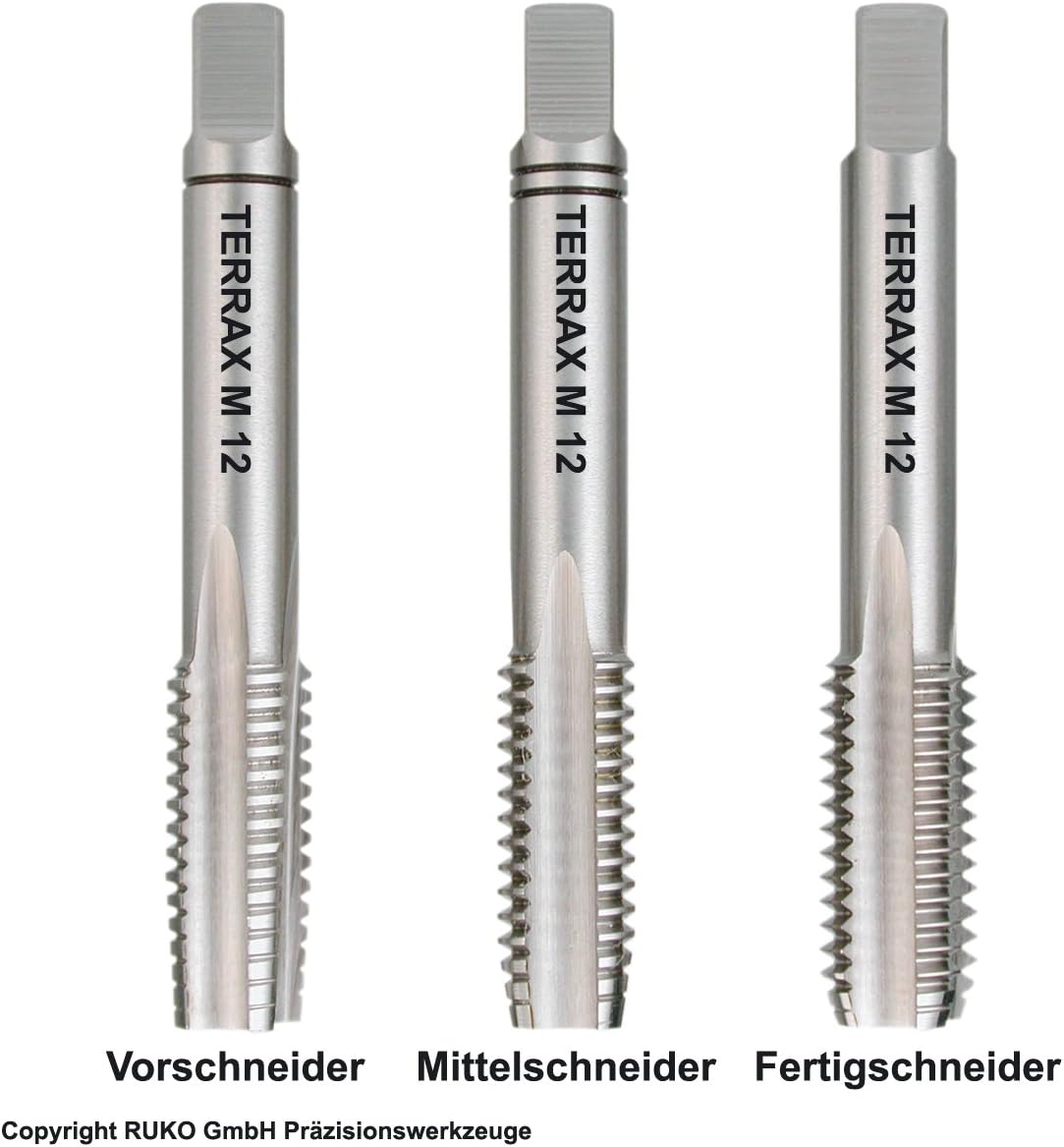 Taps of quality high-speed steel. For metric threaded through-hole or blind hole thread according to DIN ISO 13. This robust tool is suitable for all common industrial materials, such as: Unalloyed and low-alloyed steels up to 800 N/mm² strength, malleable iron and non-ferrous metals. Threaded drill hole with a diameter of 10.2 mm. The kit consists of: Taper tap: about 5-6 gear speed cutting Second tap: about 4-5 gear speed cutting Last tap: 2-3 gear speed cutting Thread: M 12 metric DIN ISO 13 Thread pitch: 1.75 mm. Flanks: relief grinding Tolerance: ISO 2/6H Surface: shiny Right-hand cutting