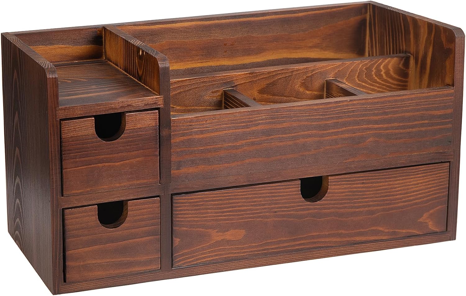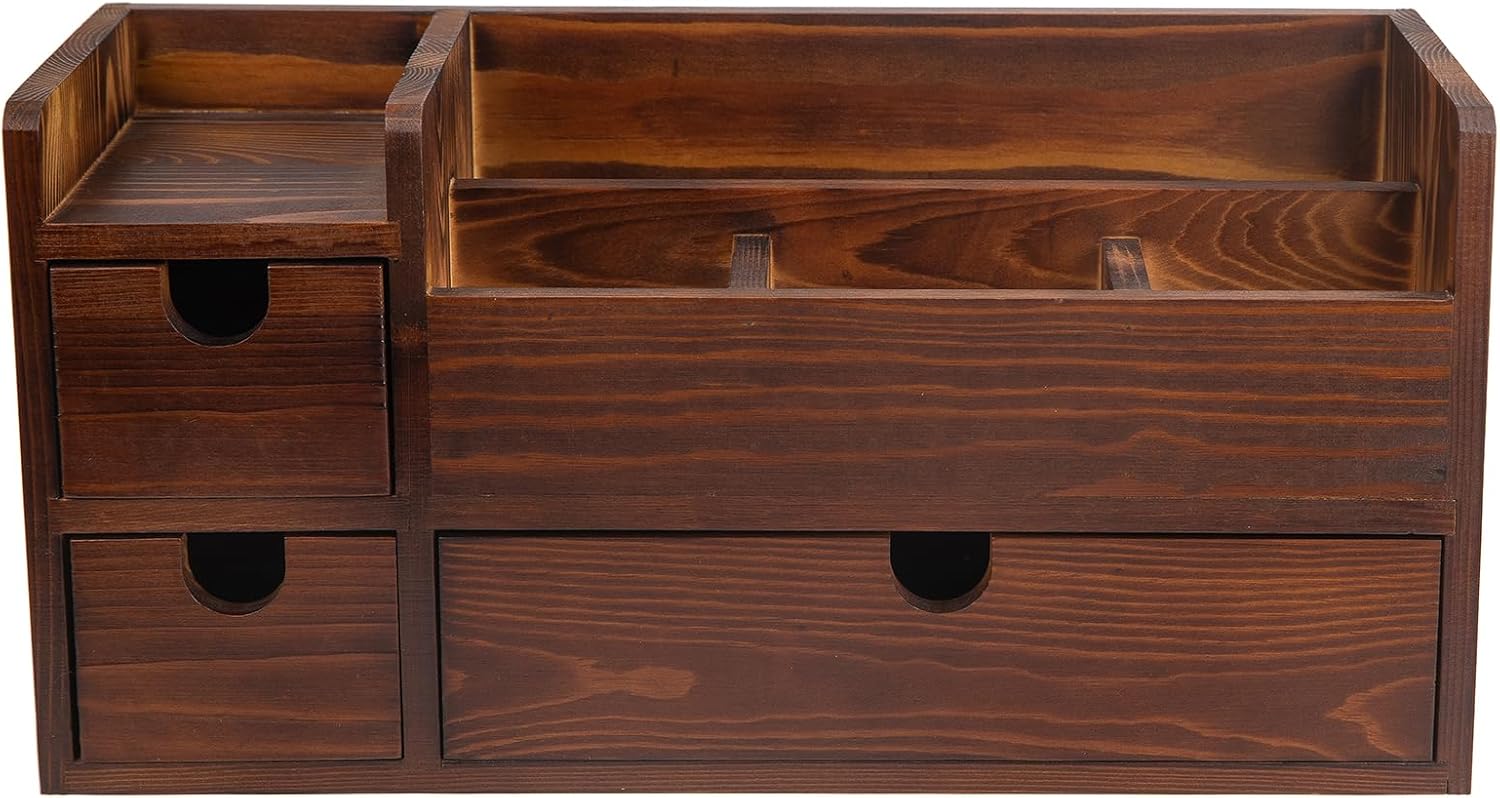 VINTAGE & VERSATILE TABLETOP WOODEN ORGANIZER WITH MULTIPLE COMPARTMENTS: This handcrafted desktop organizer, made from solid wood with a rich dark brown finish, brings both style and functionality to your workspace. With eight thoughtfully designed compartments, it offers an elegant solution to keep your desk or vanity clutter-free. The back mail slot provides a neat space for notes, letters, and other small paper items, while the three front slots are ideal for everyday essentials like pens, pencils, and scissors or cosmetic products and makeup tools. Its timeless, rustic aesthetic adds warmth and sophistication to any setting, making it a practical yet beautiful addition to your office or home. AMPLE STORAGE SPACE & PROTECTION DETAILS: Perfectly balancing style with versatility, this organizer includes three slide-out drawers—one large and two small—making it easy to store smaller items like charging cables, paper clips, or cosmetics discreetly. Designed with convenience and care, each corner has cushioned feet to protect delicate surfaces, ensuring your desk or countertop remains scratch-free. Whether used for office supplies, makeup tools, or craft essentials, this multi-functional organizer offers a stunningly efficient way to keep everything organized and within reach.