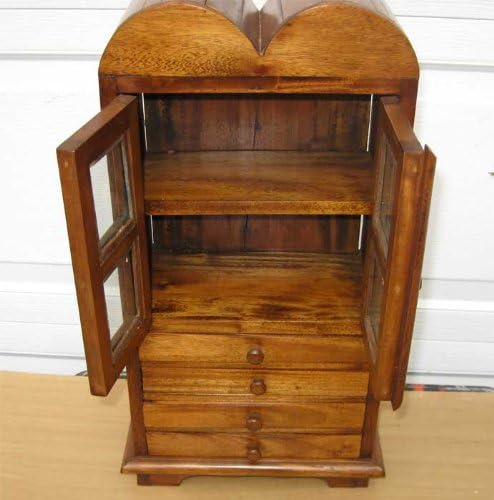 4 Drawer Rustic Jewelry Hutch Wood with Dome Top and Glass Window fronts . The Hutch measures 21" High x 11 1/2" Wide x 6 1/4" Deep. The Hutch consists of 4 drawers, inside dimensions measuring 8 1/4" Wide x 4" Deep x 1" High.. 2 Shelf measuring 4 1/4" x 9" x 5 1/2". Intricate craftsmanship. This is a new Item.
