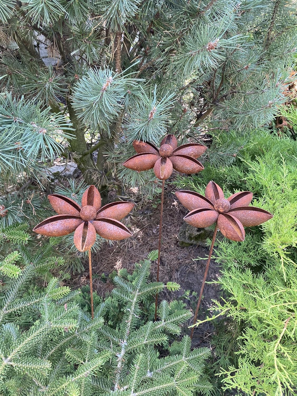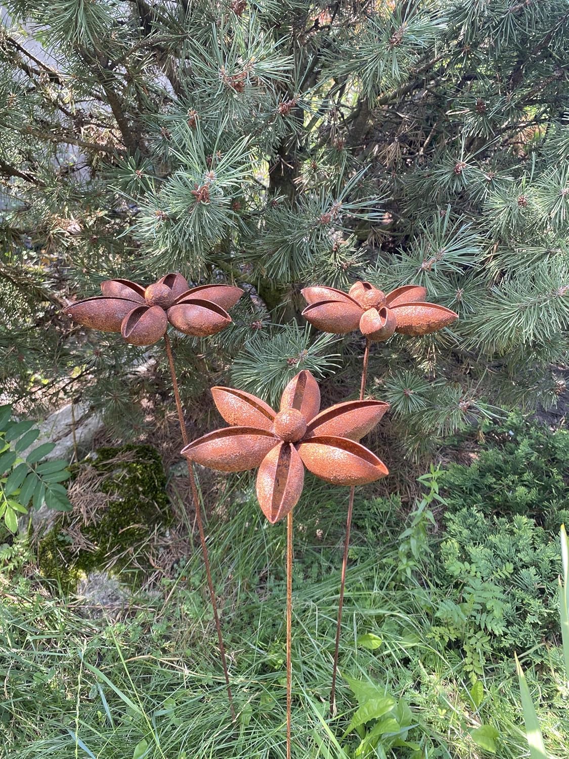 This rustic set of three handmade metal flowers is a great way to add a decorative touch to garden compositions and landscapes. They're perfect for creating a romantic and cozy atmosphere in your home. This rusty metal art is great for decorating your home, garden, backyard, terrace or entrance. This yard decor is made from natural metal and has a natural rust finish. This rusty garden decor is great year-round and can handle precipitation and direct sunlight. Spice up your outdoor spaces with our gorgeous garden decor – the perfect gift for keen gardeners. It'll be a great addition to any garden, whether it's a birthday, anniversary, housewarming or any other special occasion.