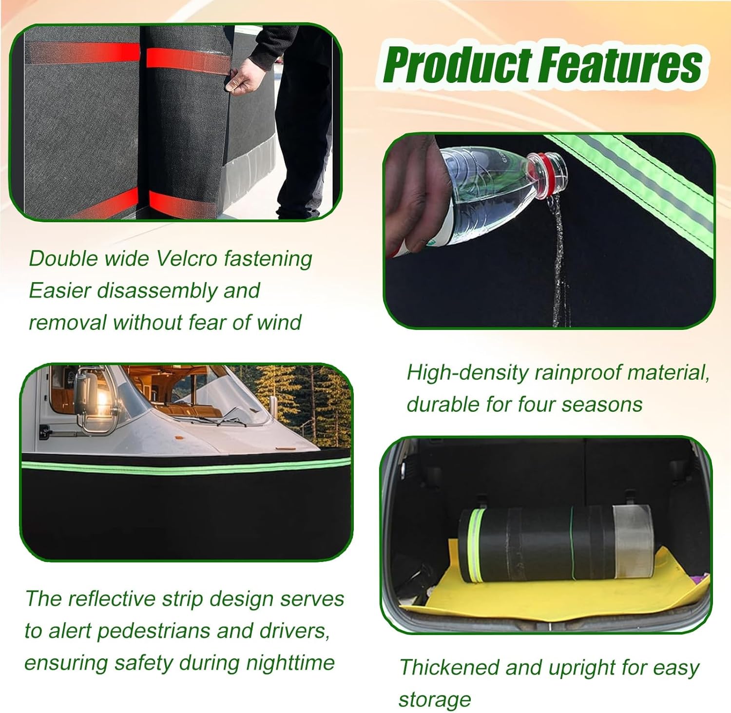 Protecting your RV from harsh weather conditions is essential, especially during periods of inactivity. Our RV Wind Deflector serves as a reliable solution, extending your vehicle's lifespan while minimizing the need for frequent washing and waxing. This sturdy skirt provides excellent protection against various elements, ensuring your RV remains in pristine condition.Product Features:- Versatile Usage: Suitable for all seasons, it effectively shields against snow and frost.- Dimensions: Length options range from 16m to 38m (52 to 124 ft), with heights of 80 cm (31.5 in), 90 cm (35.4 in), and 100 cm (39.3 in) to fit various RV models.- Durable Construction: Made from reinforced stainless steel and waterproof polyester, this robust barrier withstands impacts, preventing animals, rocks, and debris from damaging your vehicle's undercarriage.- Smart Design: The wire mesh underside ensures a weighted, thickened design that resists deformation, allowing for repeated use throughout the seasons.- Safety Features: Equipped with two reflective strips that enhance visibility at night, keeping your RV safe from passersby and other drivers.- User-Friendly Installation: The upgraded combination lock simplifies installation and removal, making it easy to set up whenever needed.Why Choose Our RV Wind Deflector?Our product not only provides exceptional durability but also offers peace of mind when it comes to protecting your investment. By choosing our wind deflector, you are ensuring that your RV is safeguarded against the elements, which translates to less maintenance and more enjoyment on your travels.For any inquiries, feel free to reach out via email, and we will respond promptly. Please note that due to manual measurements, actual dimensions may vary slightly. Invest in your RV’s protection today!