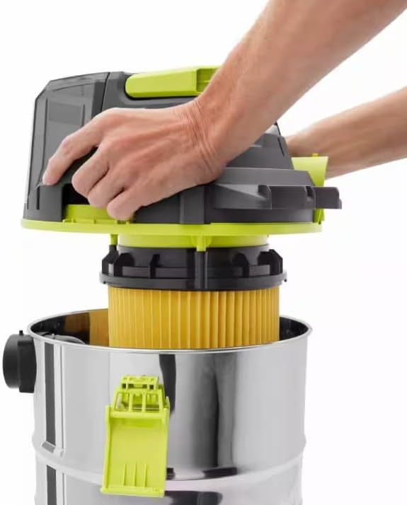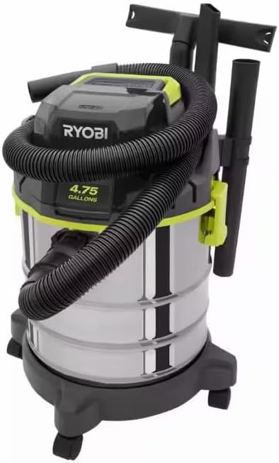 Expand your RYOBI 18-Volt ONE+ System with the PWV200B Cordless 4.75 Gal. Wet/Dry Vacuum Kit with 4.0 Ah Battery and Charger. This 18V powered vacuum offers the convenience of a cordless tool and provides a powerful 40 CFM. The 4.75 Gal. Wet/Dry Vacuum features a stainless-steel tub for added durability. The 4 caster wheels rotate 360° which allows for ultimate balanced mobility rolling over obstacles such as cords. built-in on-board accessory storage conveniently holds the included crevice tool, floor nozzle, and extension wands. The 5-ft. x 1-1/4 in. flexible hose twists securely in place to avoid accidental disconnection. The RYOBI 4.75 Gal. Wet/Dry Vac features a collapsible handle which makes for easy transportation to your mess and lays flat when storing after the job is done. The oversized latches allow the top to be easily removed and the tank emptied. The Wet/Dry Vac includes a foam filter for wet applications and a cartridge filter for dry applications. The included battery and charger are compatible with all RYOBI 18V ONE+ Tools. Best of all, it is part of the RYOBI ONE+ System