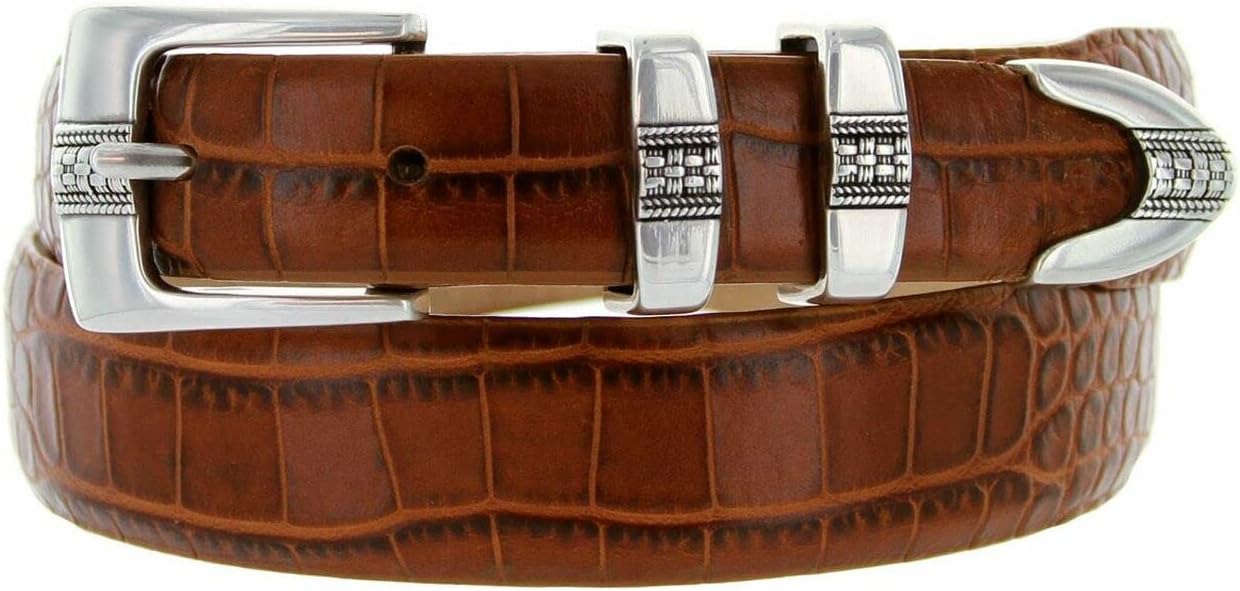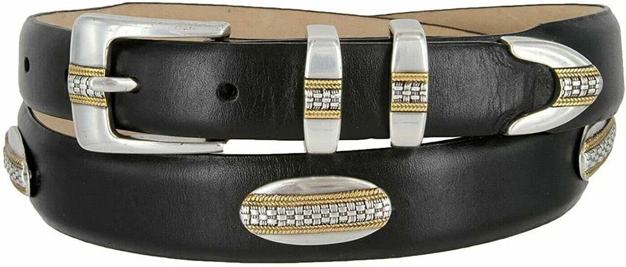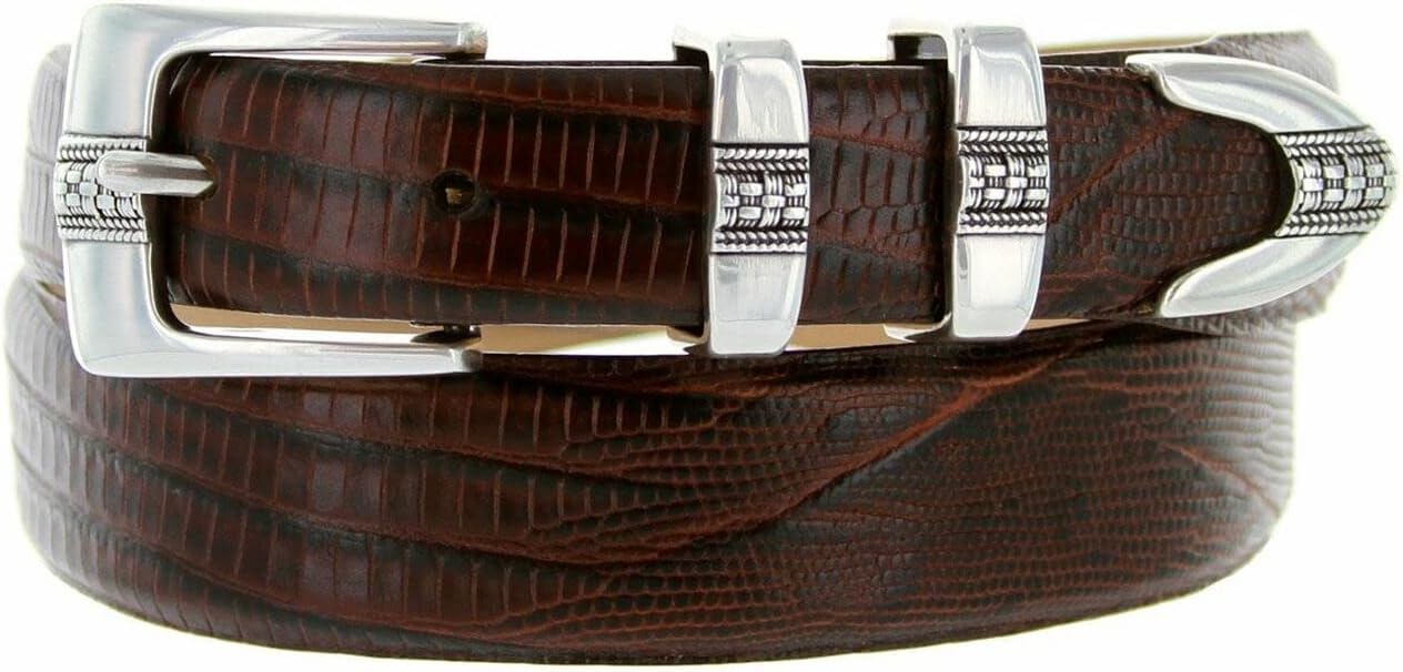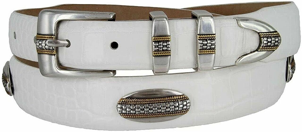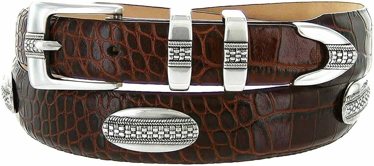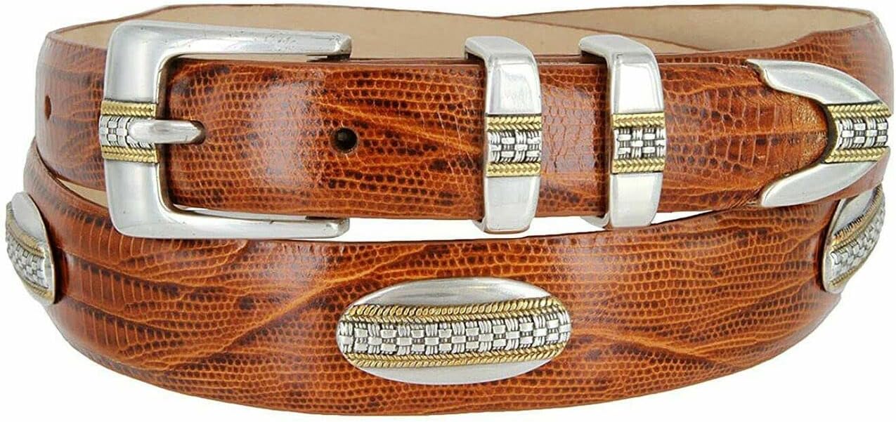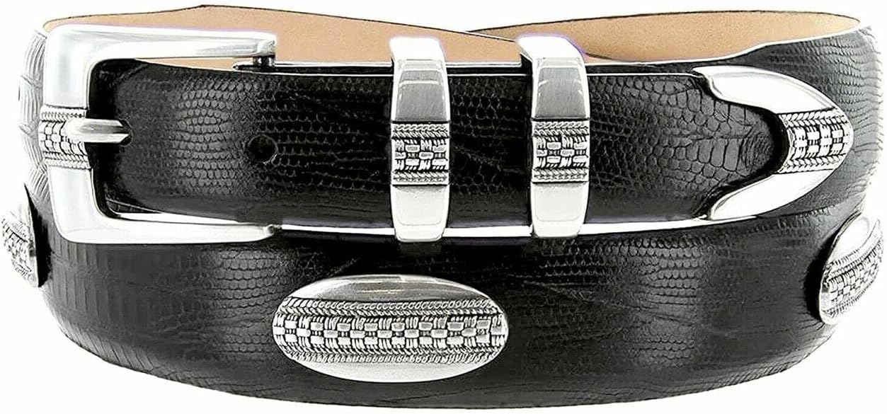 Made from High-quality Genuine Full-Grain Cowhide Leather, Hand-polished four-piece buckle set, and 5 conchos belt. 1-1/8"(30mm) taper down to 1"(25mm) wide belt with 5 belt holes for plenty of room for adjustments to offer maximum comfort. A great designer dress belt perfect for work, business, sport, and outdoor. Detailed of Alligator, Lizard embossing, or smooth leather belt. Designed and assembled in the U.S. ★★★ How to measure your Belt size ★★★: The best way is to measure around where you wear the belt and add 2 inches to the measurement. Our belts are measured from the fold where the buckle is attached to the middle hole. If you want to get the best size we recommend measuring a belt that works for you from the fold to the hole where you wear the belt.
