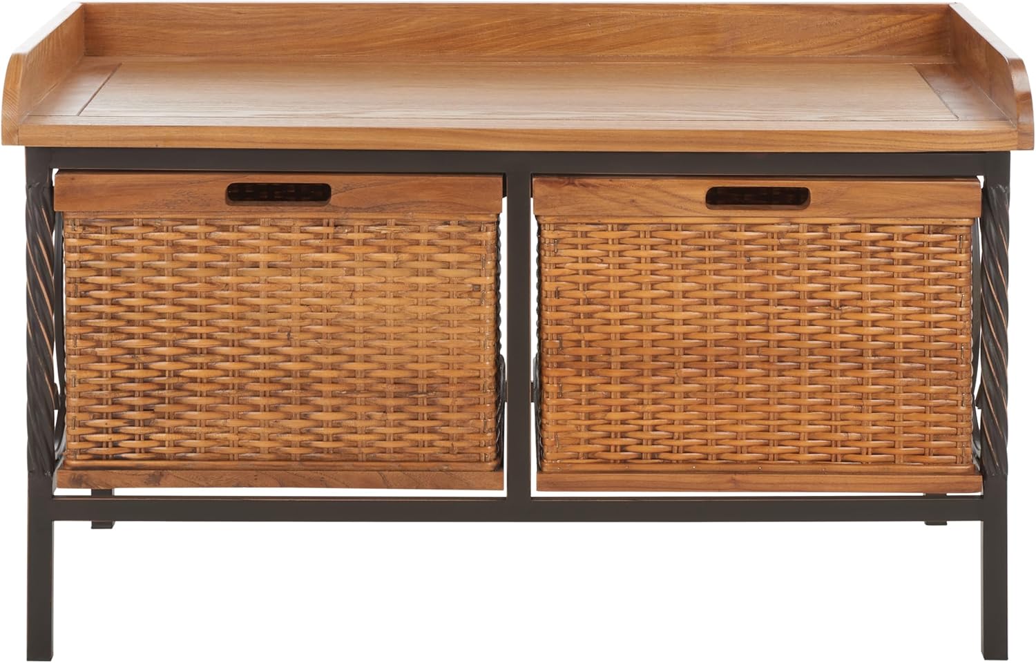 The Safavieh American Home Collection Ossett Antiqued Pewter and Light Ash Wooden Storage Bench combines both comfort and functionality. Its beautifully woven drawers provide ample storage for your household items. It is constructed from elm wood and lovely iron legs. This bench features two drawers, which each measure 14.4 inches wide by 14.8 inches deep by 9.8 inches tall. No assembly required, this bench measures 33 inches wide by 16 inches deep by 20 inches tall.