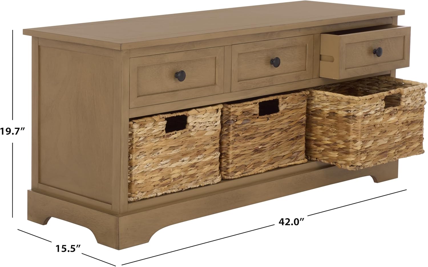 Keep clutter neatly organized with the Damien Storage Bench, a smart and stylish solution for today’s busy homes. Crafted with a sturdy pine wood frame, this versatile bench features three slim drawers perfect for smaller essentials, along with three woven wicker baskets that slide out easily for quick access and flexible storage. Ideal for entryways, living rooms, mudrooms, or bedrooms, the Damien Storage Bench blends practical design with timeless appeal, helping you maintain a tidy, welcoming space. Due to the hand-painted nature of this piece, colors may vary slightly.