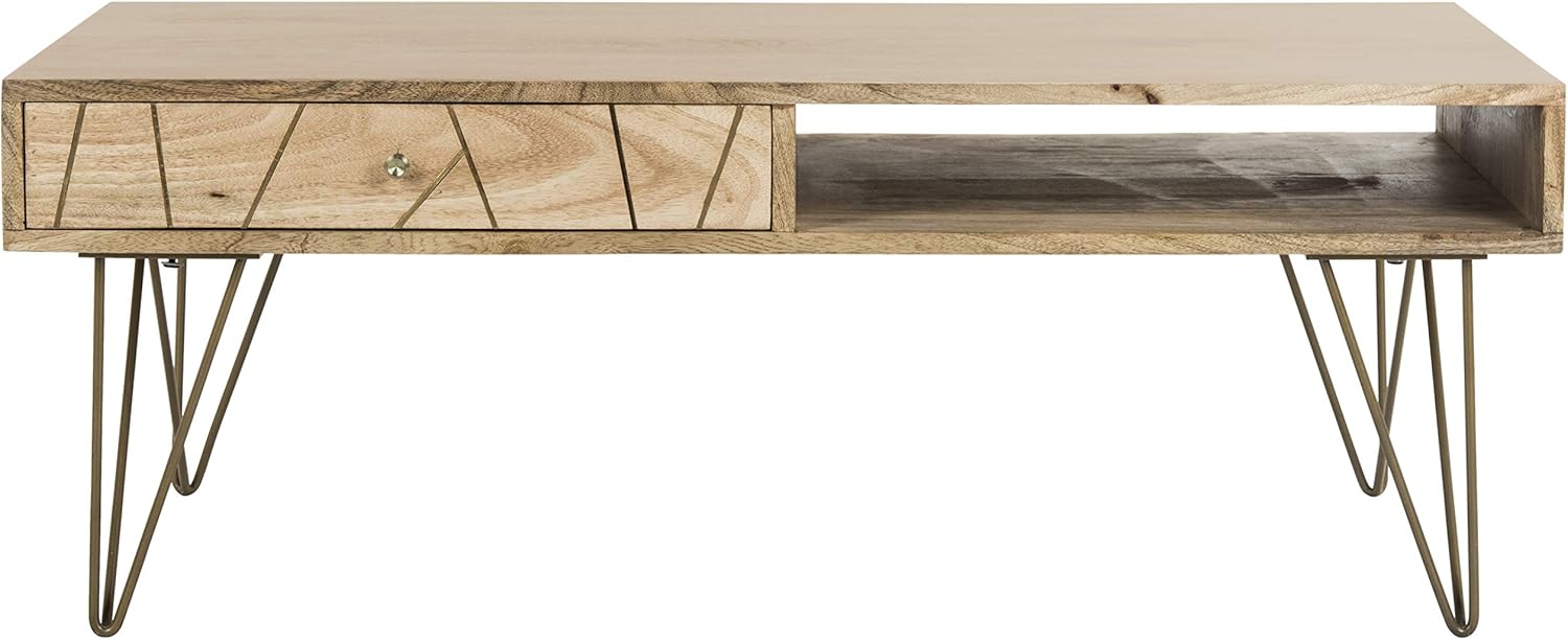 A natural beauty, this contemporary coffee table makes a grand statement in the living room. Inspired by master craftsmen, it was designed with natural mango wood and paired with geometric hairpin legs finished in brass. Designers love its ample storage drawer.