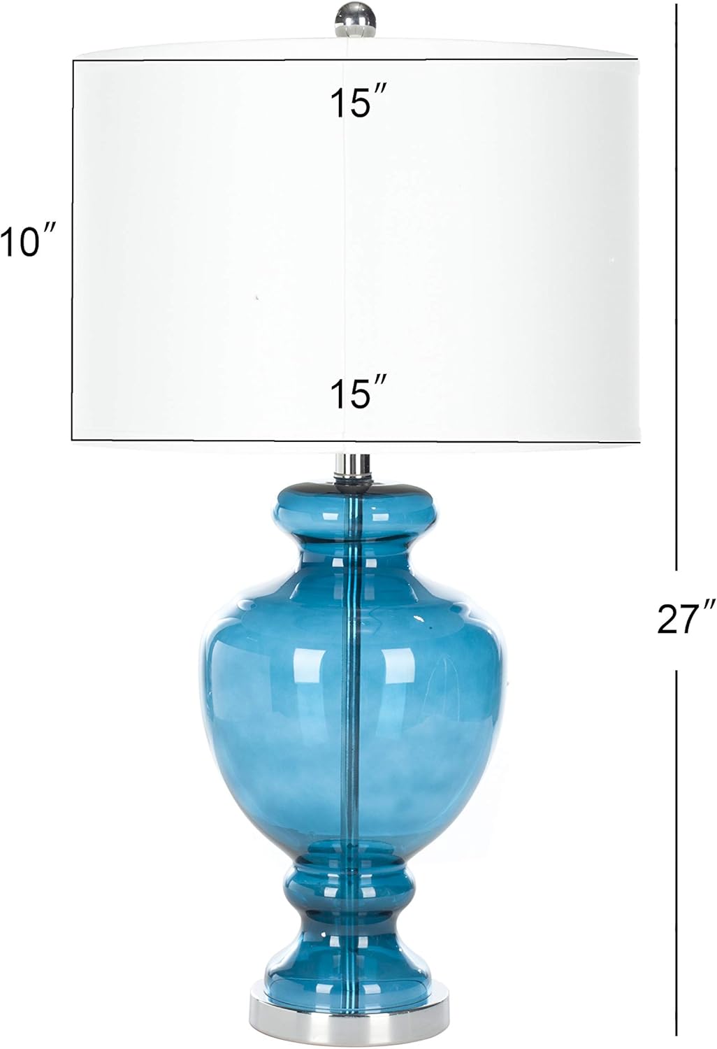 Inspired by collectible colored glass vases and bottles, the translucent morocco blue glass table lamp is a perfect accessory for coastal and cottage style interiors. Silver fittings and off-white cotton hardback drum shade update the romantic vintage look.