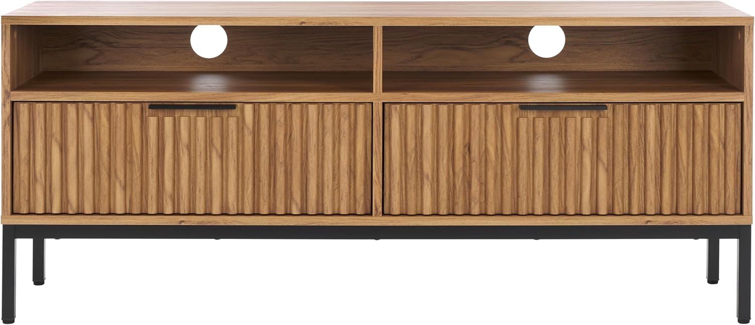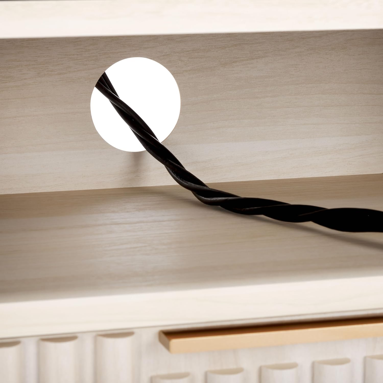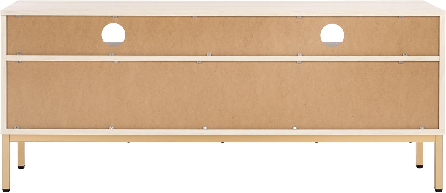 Elevate any room with the modern charm and elegance of our Lylia media stand. The clean lines and streamlined profile beautifully highlight the artisanal simplicity of our media stand. The facade adorns a stunning fluted detail to add visual depth and elegance. It showcases the rich grains of wood in a white finish. Our media unit is set on a minimalist metal base to serve as a versatile and charming addition to any corner. It features two open shelves and roomy drawers to provide adequate space for both storage and display.