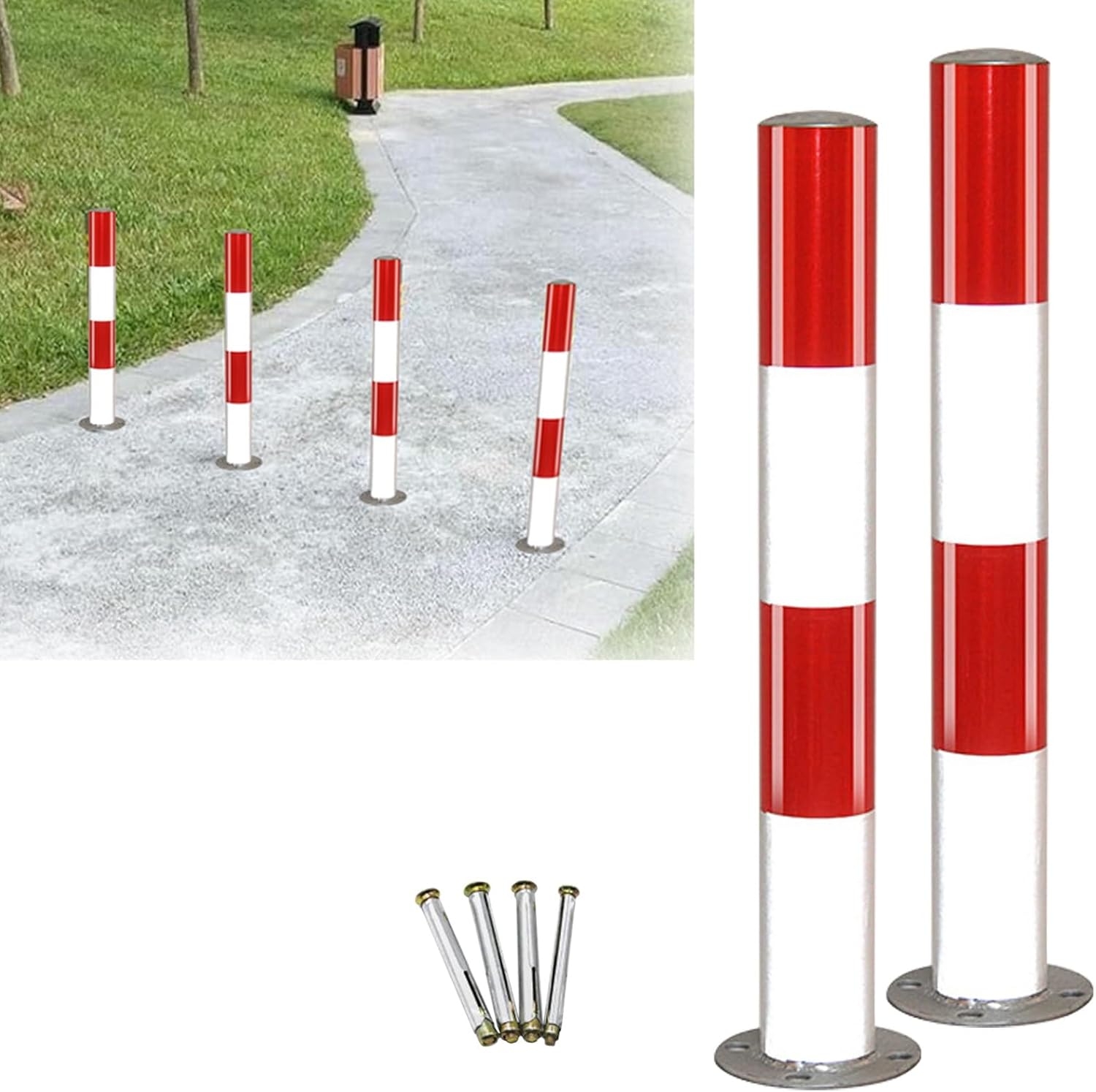 Lockable Parking Safety Barrier:To release pedestrians and equipment from vehicle or forklift collisions. These bright and strong safety bollards are the perfect solution. No one can miss it. Package List: - 2 x Safety Bollards - 8 x Screws Specification: - Material: Galvanized Steel - Color: Black and Yellow,Red and White - Wall Thickness: 3mm (0.12in) - Height: 60cm (23 5/8in),75cm (29 1/2in) ,80cm (31 1/5in) - Diameters: 7.6cm (3in) ,9cm (3 1/2in) ,11.4cm (4 1/2in) Specification: - The reflective tape enhances visibility. - Easy to install with a full range of accessories. - Can be disassembled and installed at any time. - Thicker wall thickness ensures maximum solidity and stability for long time use. - Great for protecting an area where you don’t want people to drive or to be cautious. Please Note: - Please allow a slight dimension difference due to different manual measurements. - Due to the light and screen setting difference,the item's color may be slightly different from the pictures. Quality Service: - If you have any issues with our products please feel free to contact us.