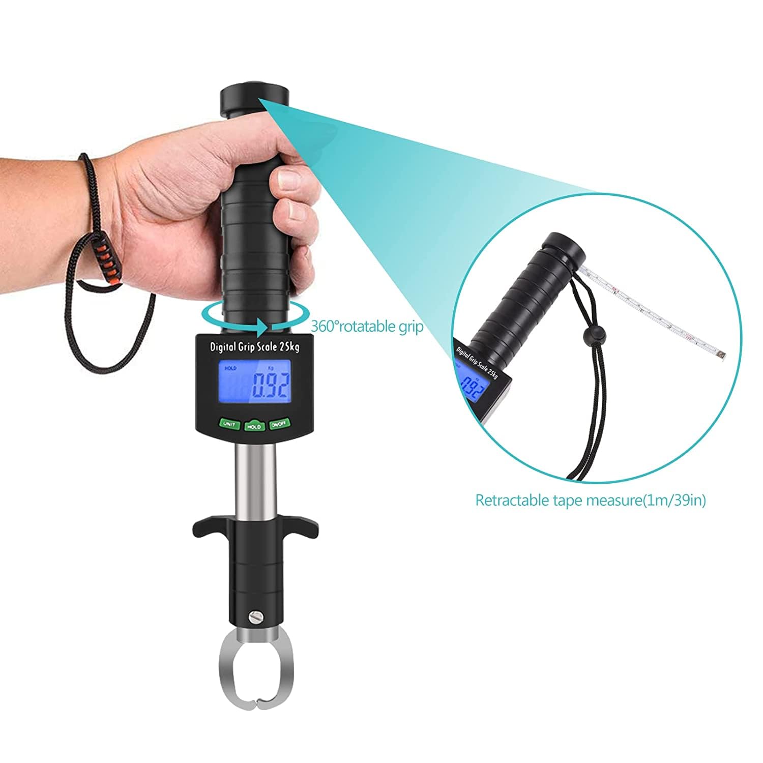 Features: This product combines fish gripper, weight scale and tape measure in one, which is very practical and convenient to measure the weight and size of the fish you catch.Stainless steel gripper and tough ABS plastic.Heavy duty spring action ensures firm grip.Anti-slip handle, convenient to hold and operate.Gripper swivels independently of handle for convenient handling of fish.With a lanyard for easy carrying, and not easy to lose. Specification: Material: Stainless steel + ABSColor: BlackWeight Unit: lb, oz, kgBattery Type: 2 x AAA batteriesLength: 31cm/12.2inWeight: 385g / 13.6oz (approx.) Package Included: 1 * Digital Fish Grip Scale