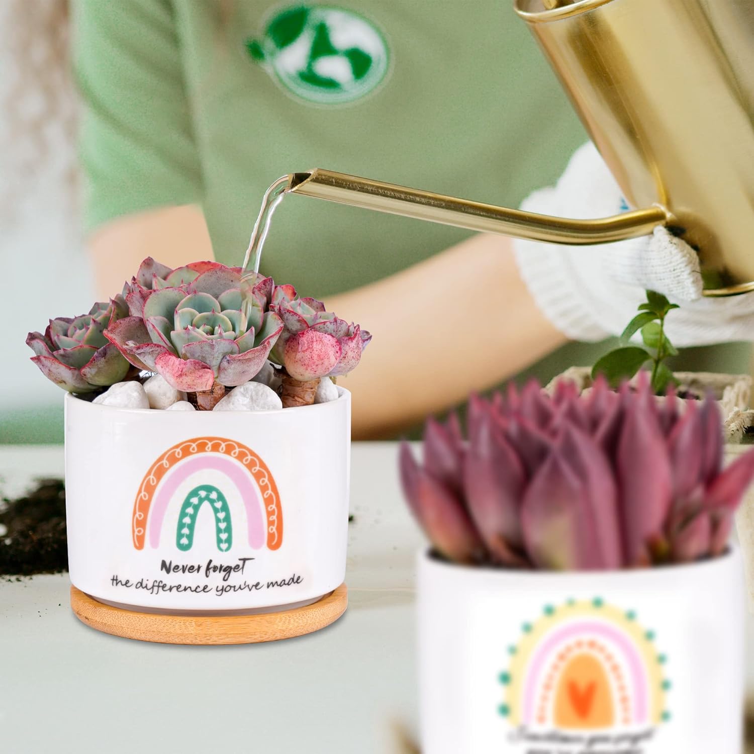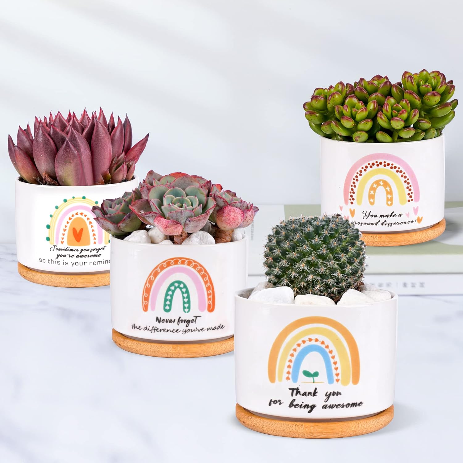 Package includes: each funny succulent plant pot set includes 9 succulent pots and 9 bamboo trays, which are an ideal size to fit on your desk or window sill at home; enough for your personal use demands, also you can share with others Perfect appreciation gifts:Designed with warm quote “so grateful for you” ,“Thank you for all that you do”,"May you be proud of the work you do,the person you are,and the difference you make" and other fun taglines, thankful notes to encourage your teammates, volunteers, employees and more Suitable Size: each succulent plant pot measures 2.2 inches (about 5.6 cm) high and 3.11 inches (about 7.9 cm) wide; The tray material is quality bamboo, the tray size is 8.1 cm/ 3.2 inches wide and 1 cm/ 0.4 inches high; They are packaged in an approximately 11.4 x 7.1 x 3.9 inches/ 29 x 18 x 10 cm Quality and function: these succulent plant pots are made from natural soil and heat oven treated; Natural soil aids in the ventilation and growth of plants,each of the ceramic succulent planters nurse birthday gifts features a drainage hole at the bottom to ensure smooth water drainage and air circulation Ideal Gift Choice: you can send the thank you ceramic succulent planters as gifts to your employee, partner, friend, teammate, teacher, nurse, family member, staff or leaving colleague on Christmas, going away, birthday, Thanksgiving, which will help you express your sincere gratitude and appreciation