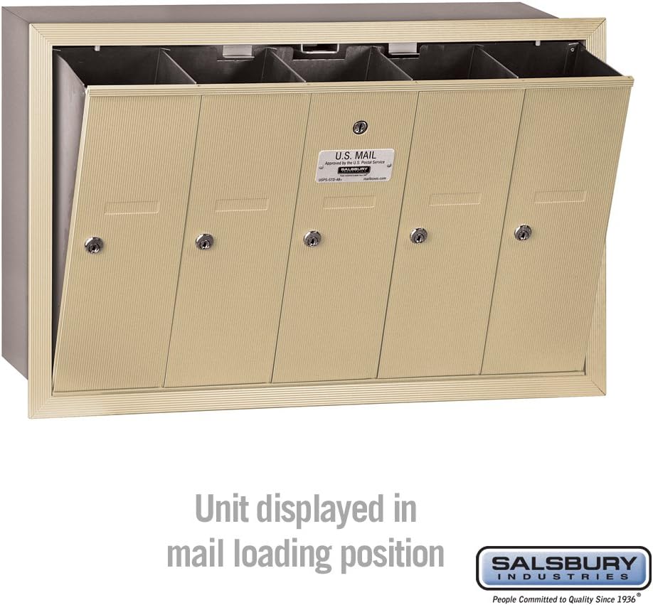 Product Description Salsbury 3500 Series Vertical Mailboxes - Recessed Mounted - U.S.P.S. Access are are U.S.P.S. approved for replacement and/or retrofit installations. Ideal for apartments, condominiums and commercial buildings. Made entirely of aluminum. Feature a durable powder coated finish available in aluminum, brass, bronze, sandstone and green. Rough opening for recessed mounted vertical mailboxes is 1-1/2" less than the unit's width, 1-1/4" less than the unit's height and equal to the unit's depth. Fits into a rough opening and secured with mounting hardware (not included) through the back or side panels. Units include a fully integrated flanged collar which fits over the rough opening. Doors and trim are striated to resist scratching. Mailboxes are available with 3 to 7 compartments. Salsbury Industries is an ISO 9001: 2008 certified company and has excelled in the field of manufacturing since 1936. From the Manufacturer Salsbury 3500 Series Vertical Mailboxes - Recessed Mounted - U.S.P.S. Accessare are U.S.P.S. approved for replacement and/or retrofit installations. Ideal for apartments, condominiums and commercial buildings. Made entirely of aluminum. Feature a durable powder coated finish available in aluminum, brass, bronze, sandstone and green. Rough opening for recessed mounted vertical mailboxes is 1-1/2" less than the unit's width, 1-1/4" less than the unit's height and equal to the unit's depth. Fits into a rough opening and secured with mounting hardware (not included) through the back or side panels. Units include a fully integrated flanged collar which fits over the rough opening. Doors and trim are striated to resist scratching. Mailboxes are available with 3 to 7 compartments. Salsbury Industries is an ISO 9001: 2008 certified company and has excelled in the field of manufacturing since 1936.