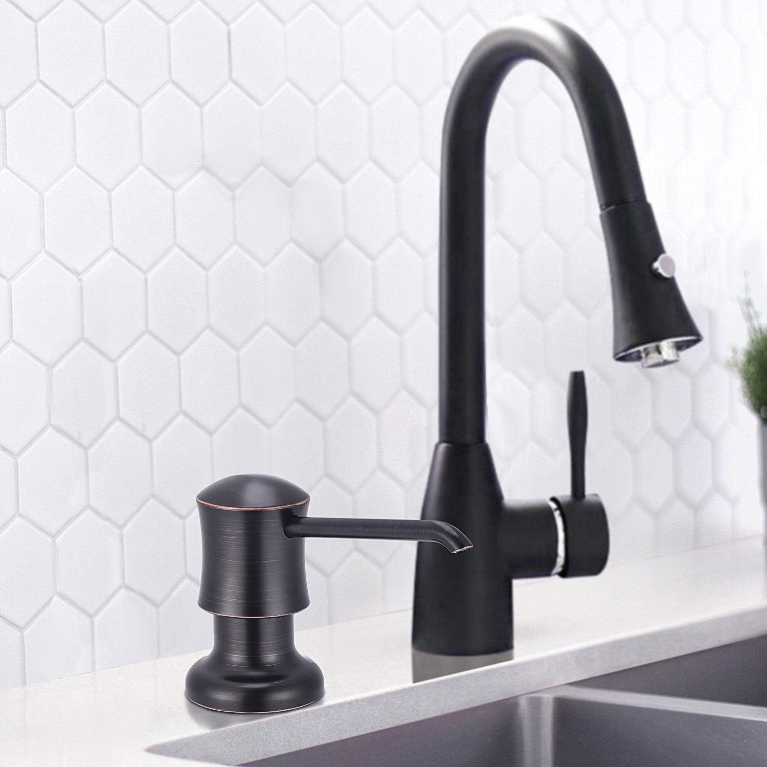 F060 Brass Sink Soap Dispenser: ❤BUILT TO LAST -- Durable solid brass construction pump head with PE plastic bottle, it’s resistant to acid and corrosion and durable and the Black Matte finish is easy to clean. ❤ABOVE THE COUNTER RE-FILL -- The soap dispenser for kitchen sink replacement with pull-out removable pump head makes refilling this sink soap dispenser a freeze. No more crawling under the sink. ❤EASY TO PUMP -- This soap dispenser has a 3-inch nozzle that reaches over the sink, the pump head swivels 360 degrees. You can pump it and output a suitable amount of soap easily. There is no leak, clog or jam when pressing for soap. ❤LARGER VOLUME --The soap dispenser for kitchen sink has large capacity (17 oz) bottle, 3" nozzle.Dish soap can be pumped into the sink manufactured with quality materials works as a soap dispenser or as a lotion dispenser. ❤WARRANTY AND TECHNICAL SUPPORT -- We provide our products with lifetime limited warranty. If you have any dissatisfaction with our sink soap dispenser, just message us via Amazon at any time! F037 ABS Sink Soap Dispenser: ✔️【MODERN LOOKING & DURABLE MATERIAL】Delicate built-in design make your kitchen countertop looks clean and tidy . Fitting almost all modern kitchen. The ABS brass pump is durable and anti-corrotion ✔️【REFILLED FROM THE TOP 】 Our sink soap dispenser epuiped with an 17oz soap bottle, you just need to remove the pump head and refill soap from the top when the soap use out. No more Kneeling down under the sink to refill the soap liquid ✔️【EASY TO INSTALL】A detailed step-by-step installation instructions is included, no require plumber,finish DIY installation only takes you a few minutes ✔️【SCOPE OF APPLICATION 】 Long shank perfect for granite counter tops and deep deck installation, reservoir bottle is clear for easy viewing of contents, perfect for Liquid soap, Lotion or Liquid detergent.