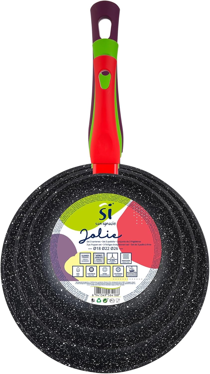 •Set of 3 pans consisting of 1 pan with red handle Ø18cm / 1 pan with green handle Ø22cm / 1 pan with purple handle Ø26cm •Made of high quality forged aluminium for corrosion and wear resistance. •The interior of the pieces has a marbled non-stick that promotes proper cooking of the foods preventing them from sticking to the base and facilitating cleaning. •The piece incorporates an induction bottom that allows the heat to be effectively distributed throughout the piece. This bottom is compatible with all cookers on the market, including induction cookers. •Soft touch technology handle offers a pleasant touch finish for a much more comfortable and secure grip of the piece. Each piece features a different color - green, red and purple. The Jolie pans set has been made of high quality forged aluminium offering a unique corrosion and wear resistance to the pieces. The interior is equipped with a marbled coating with small colour specks that favors perfect cooking of food, prevents them from sticking to the base and also makes cleaning easier. The base incorporates an induction bottom that allows a quick and optimal heat distribution throughout the piece. This bottom is compatible with all cookers on the market, including induction cookers. The handle of each piece has a different colour finish, and incorporates the soft touch technology offering a pleasant touch, comfortable and secure grip.