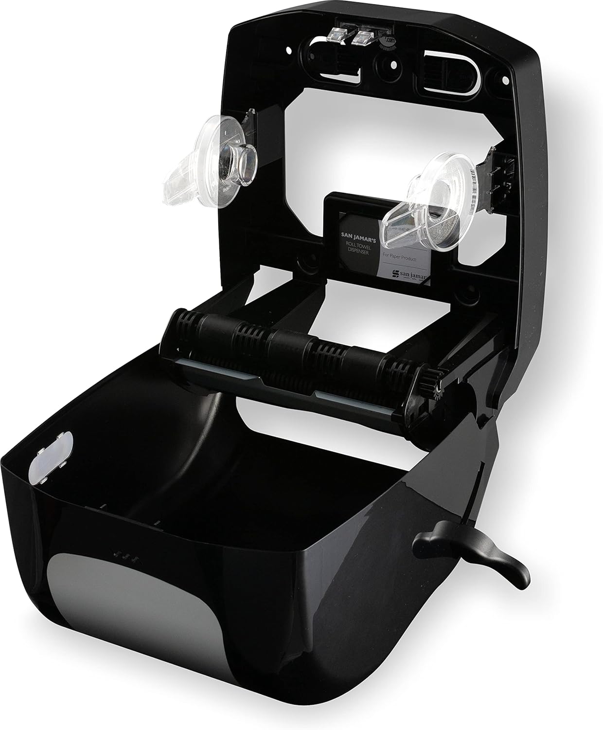 The San Jamar Summit Paper Towel Dispenser is a top-tier solution for high-traffic areas such as bathrooms, kitchens, and restaurants. Featuring a 1.5"" core, this dispenser is designed for high-capacity dispensing, capable of storing a standard 800' 8"" roll towel. This substantial capacity significantly reduces the need for frequent refills, enhancing convenience and efficiency. The Summit Lever Roll Towel Dispenser offers exceptional versatility with its universal roll capacity. It accommodates all roll paper qualities, regardless of core size, including coreless, solid, and centerpull. This adaptability ensures seamless integration with various restroom setups and existing supplies, making it a perfect fit for any environment. The ergonomic lever handle of this dispenser guarantees ease of use, providing a user-friendly experience for all. Its intuitive design simplifies towel dispensing while minimizing waste, promoting cost-effectiveness and sustainability. Constructed from durable plastic with a sleek blue finish, the dispenser combines robustness with aesthetic appeal. Its sturdy build ensures long-lasting performance, while the modern design enhances the look of any space, adding a touch of style to practicality. Ideal for busy environments, the San Jamar Summit Paper Towel Dispenser ensures a continuous supply of towels, reducing maintenance time and improving overall user satisfaction. (Model Number - T970BKSS).
