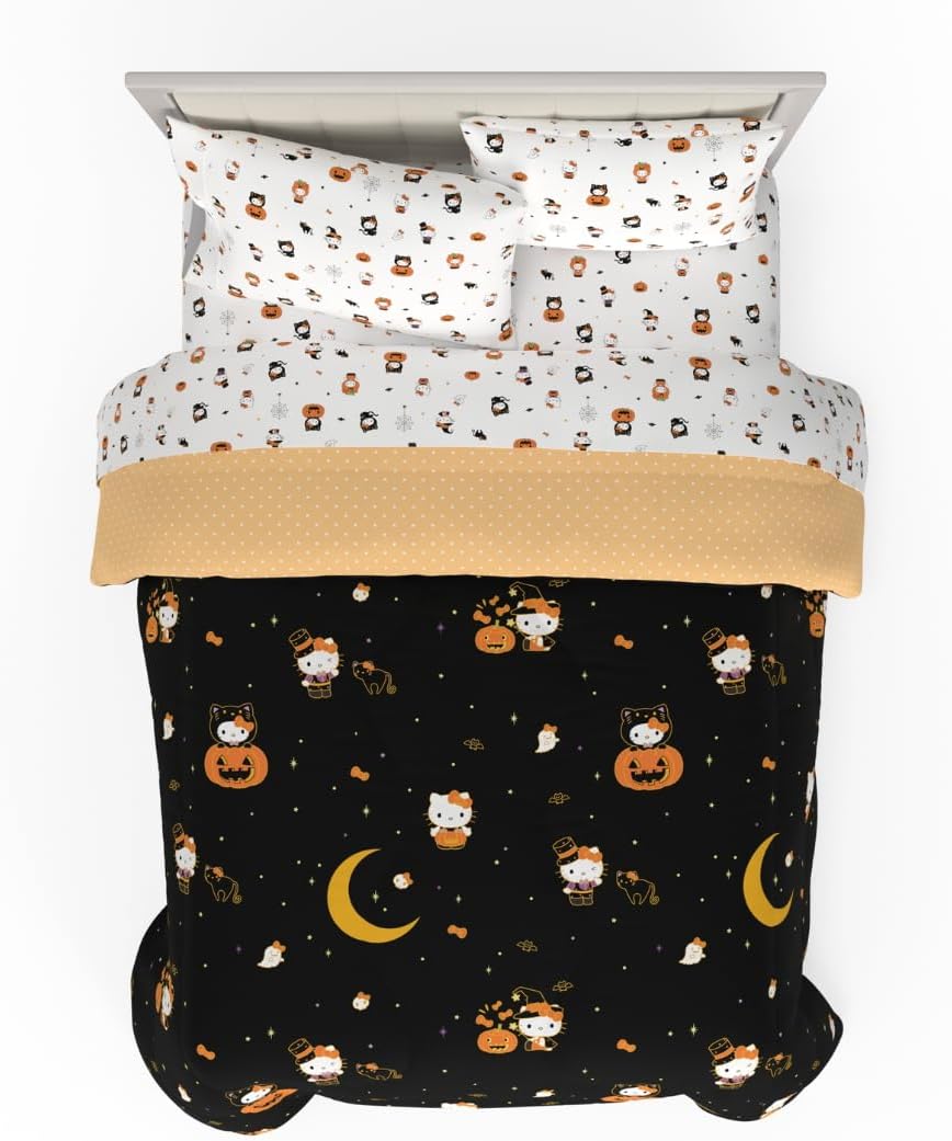 Drift into a world of sweet and sassy dreams with this My Melody and Kuromi Bed Set! One side of the comforter features Kuromi striking playful poses on a bold black background, while the reverse showcases My Melody surrounded by hearts on a soft pink backdrop. Whether you’re feeling mischievous or totally kawaii, this reversible design lets you change the vibe whenever you want. The coordinating sheets add extra charm with an allover print of My Melody and Kuromi in pastel tones. Made from super soft, cozy microfiber, this set includes a comforter, fitted sheet, flat sheet, and pillowcase(s) and comes in sizes twin through full. It’s the ultimate combo of comfort and Sanrio style, perfect for fans of all ages. Easy to care for and machine washable, this officially licensed bedding brings a splash of cuteness and comfort to your room. Snuggle up, show off your favorite characters, and turn bedtime into a magical Sanrio moment!