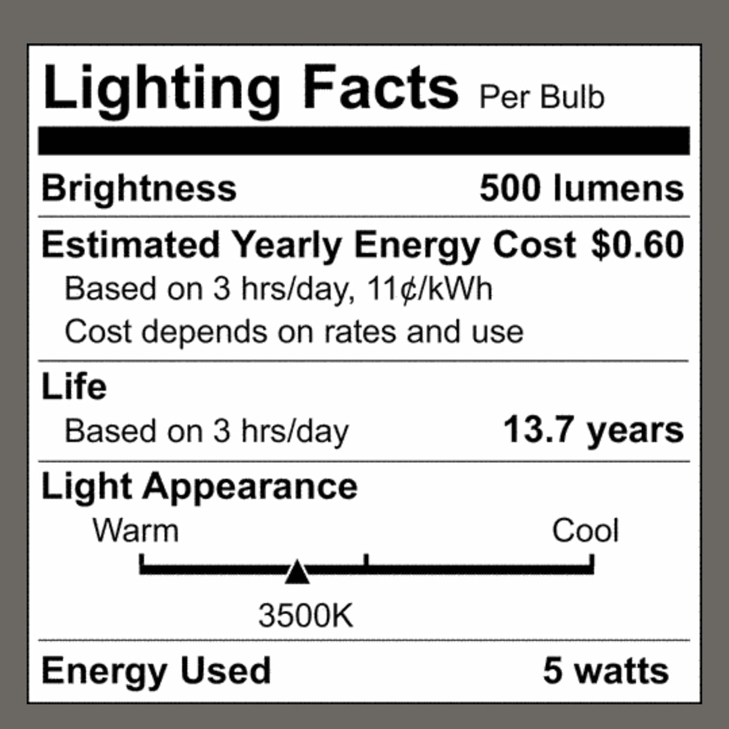 | Incandescent Equivalent Wattage | 60 Watts |