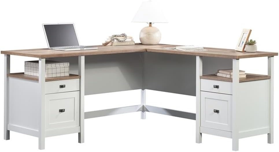 Add the simple warmth and cordial style of the Cottage Road collection to your home or workspace with this L-shaped desk. This home office desk brings the perfect mix of desktop workspace, open shelving, and closed storage inside drawers. It features four drawers with full extension metal slides – perfect for storing pens, a stapler, notepads, lip balm, and other stuff handy to have around the office. The two lower drawers hold letter or legal-size hanging files, keeping your L-shaped desk with drawers organized and clutter-free. The spacious 1" thick top surface of this desk with open shelves can easily accommodate your computer, a lamp, photos of your family, or a small printer. The top and shelves feature a contrasting Lintel Oak accent that complements the cottage styling. This L-shaped desk with storage includes a cord management system with desktop grommet holes to organize chargers and cords to keep your desk free of wire entanglement. Finished white on all sides for versatile placement, this L- desk looks polished from all angles and adds a clean design along with functional storage to your office space.Features:- Finish: White- Material: Engineered wood- Durable, 1" thick top.- Four drawers feature full extension slides.- Lower drawers hold letter or legal size hanging files.- Open shelves for additional storage.- Meets BIFMA standard x5.5 for safety, durability, and structural performance.- Finished on all sides for versatile placement.- Cord management includes desk top grommet.- White finish with Lintel Oak accents.Specifications:- Product Dimensions: 29.764" H x 65.118" W x 65.118" D- Product Weight: 179.98 lbs.