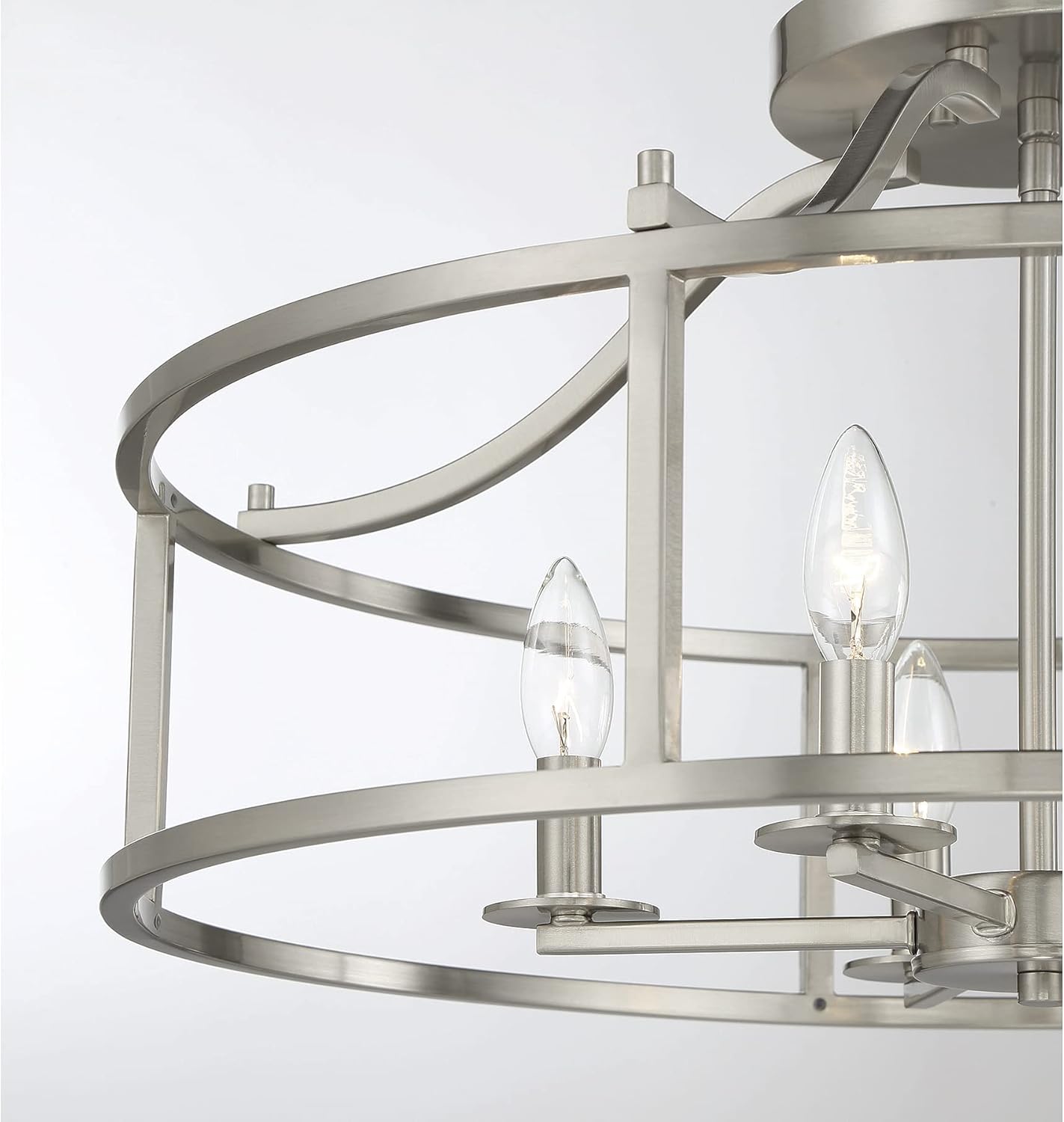 The sizable Savoy House Stockton 5-light ceiling light is a great way to boost the illumination and style throughout the home. It has a sleek, drum-shaped open shade finished in satin nickel that lets the lights within shine bright. Stockton is 12" in height and 24" in width. It uses five candelabra size bulbs of up to 60 watts per bulb.