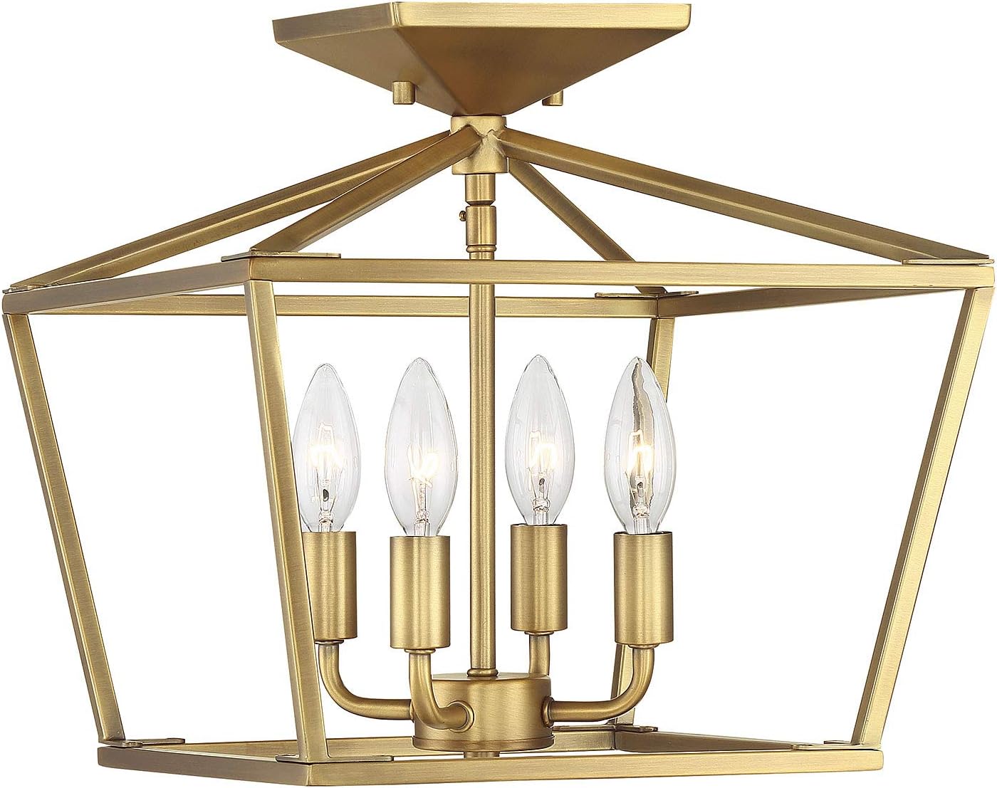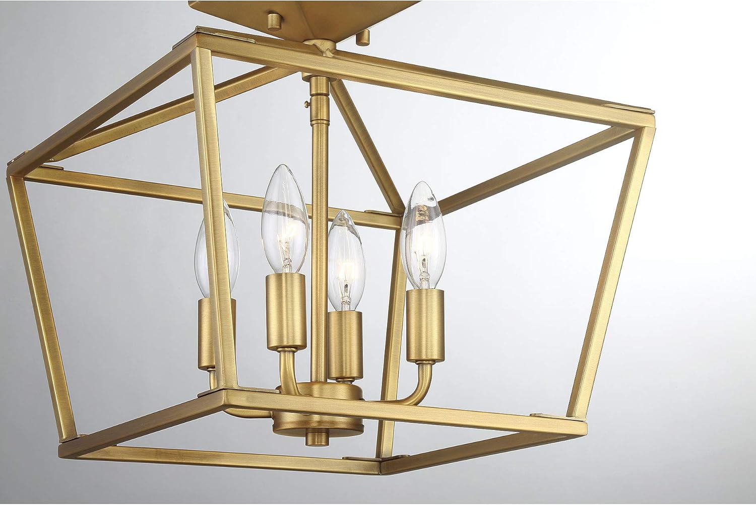 When you have a traditional aesthetic and want to inject a sense of modernism, choose this Townsend ceiling fixture. It’s a classic lantern style with the familiar vintage appeal of colonial or old English candle fixtures, but the open geometric frame and warm brass finish create a delightful contemporary twist. This timeless quality blends very well with your traditional, transitional, bohemian, contemporary or modern farmhouse decor. Four lights within the open framework have metal candle covers and hold 60W candelabra size bulbs. The fixture is 13" wide and 13" high with a semi-flush mounting, making a superb fit for your dining room, kitchen, living room, entryway, bedroom, closet, family room, office, stairway or great room.