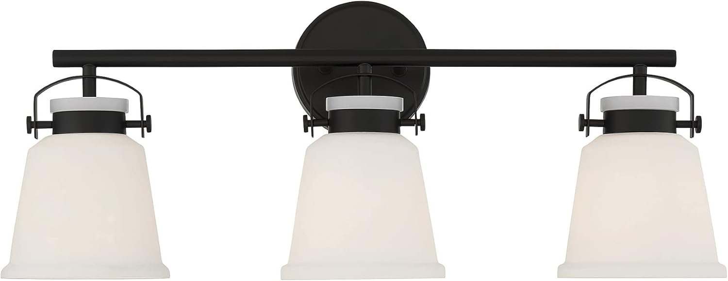 The Kaden 3-light bathroom vanity light from Savoy House has a classic look with a hint of industrial inspiration. White opal glass shades are held in place with eye-catching hardware that, like the bar and backplate, is finished in polished chrome. Kaden is 10.5" in height, 26" in width and extends 7" from the wall. It uses three standard size bulbs with a max of 60 watts per bulb. Damp area rated.