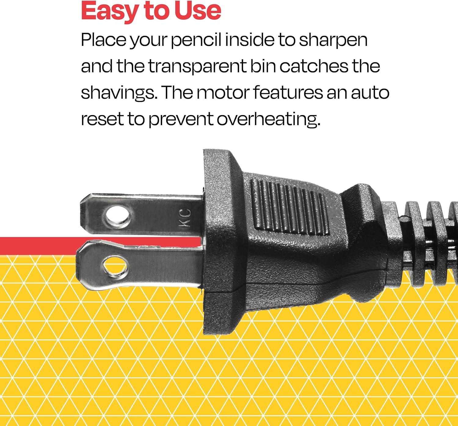 If you are looking for a non-traditional sharpener, this contemporary design is for you. Single hole sharpener features an extra large easy-to-empty transparent shavings receptacle that prohibits operation if removed, heavy-duty motor, helical steel blade, an auto pencil stop for a perfect tip every time. It also includes non-skid rubber pads for stable operation. Measures 6 x 4 inches and features 2 sleek colors; black and gray.