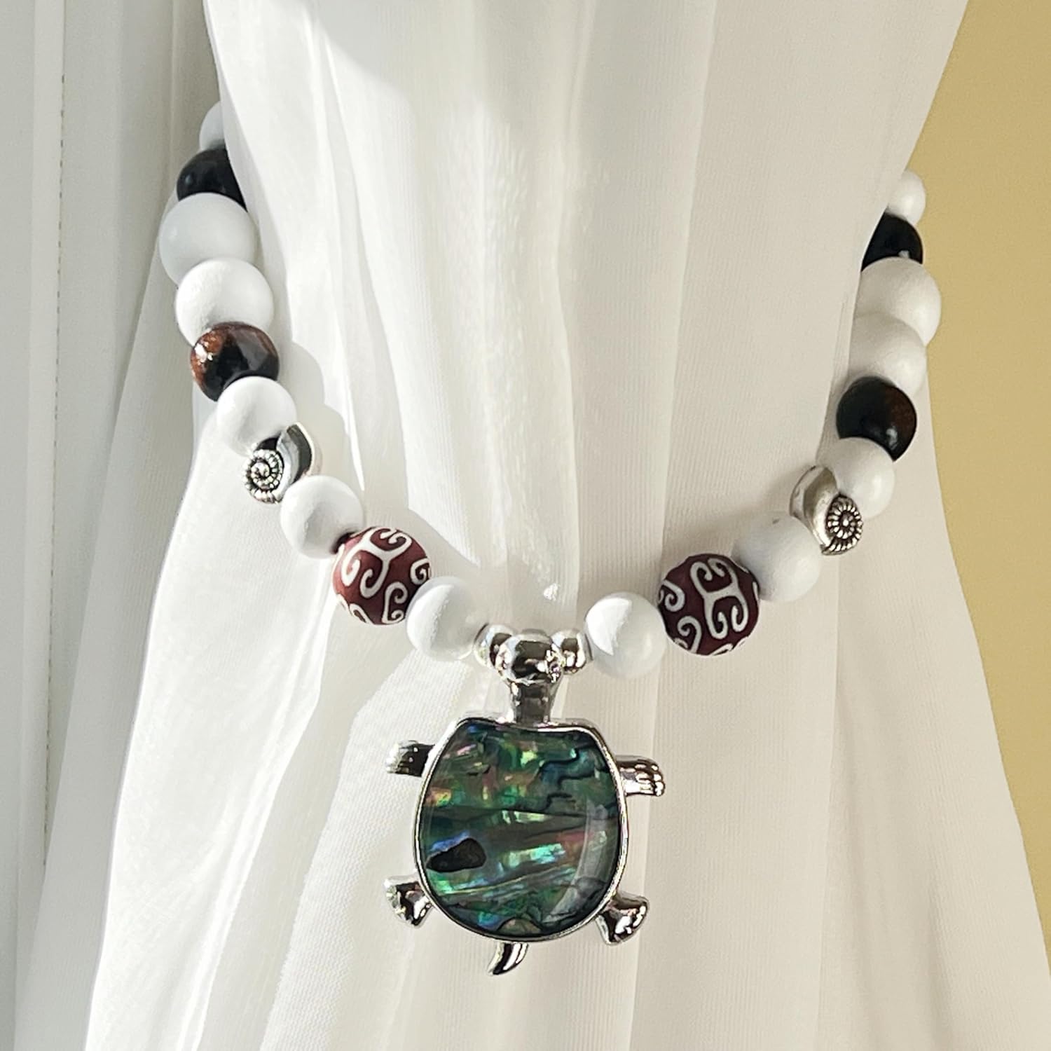 Transform your window treatments into a coastal masterpiece with these enchanting sea turtle curtain tiebacks. Each tieback features a stunning abalone shell pendant crafted into the shape of a sea turtle, showcasing nature's iridescent artistry with shimmering greens, blues, and pearl tones. The turtle pendant is elegantly framed by a strand of alternating white wood beads, rich brown wooden accents, and decorative burgundy beads with intricate spiral patterns. Silver-toned metal accents add a sophisticated touch to the overall design. Perfect for beach house decor or bringing an oceanic touch to any room, these tiebacks combine functionality with artistic beauty. The substantial beaded design ensures your curtains stay gracefully swept aside while adding a distinctive decorative element to your window space. Each set includes two matching tiebacks, providing a coordinated look for your window treatments. These versatile tiebacks work beautifully with light or heavy curtains and complement both casual and formal coastal decor styles. MEASUREMENT: 18 inches from end to end - then a 3/4 inch ring for hanging. This listing is for 1 set (2 strands)