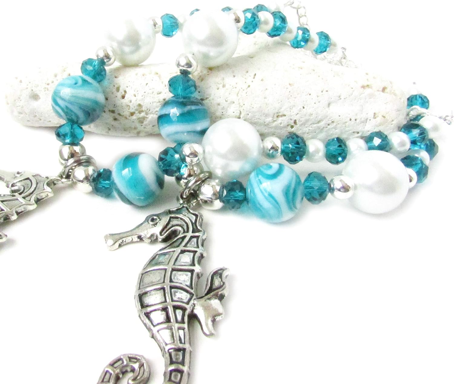 These seahorse curtain tiebacks are an exquisite way to bring the beach right into your home. Featuring large matching swirl beads and white round "pearls," they add a touch of beautiful coastal decor to any room. Their design effortlessly captures the essence of the sea, making them an ideal addition for beach lovers looking to enhance their home with a touch of oceanic charm. These charming accessories not only hold your curtains back but also serve as a statement piece in your beach cottage chic decor. Whether you are decorating a seaside retreat or simply wish to bring a coastal vibe to your everyday living space, these tiebacks are a beautiful and practical solution. Sold as a set of two strands, these seahorse curtain tiebacks make an excellent gift for those who adore beach-themed decor. Their whimsical design and functional use bring both joy and utility to any home. Add a splash of the sea to your living space and let these charming tiebacks transform your curtains into a coastal masterpiece. Measuring 18 inches long, each tieback is adorned with a 2-inch seahorse, serving as a delightful focal point. The tiebacks come with a metal ring on each end, ensuring easy and secure hanging. This is for a set ( 2 strands)