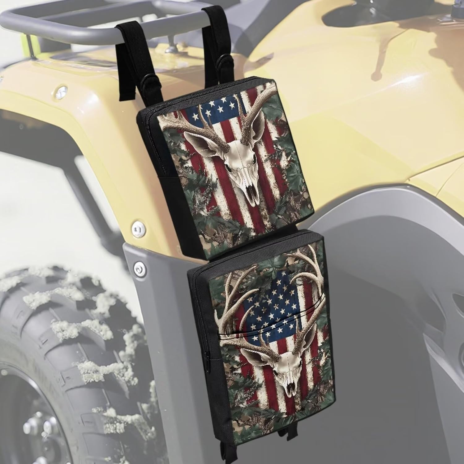 Specification Size : Please check our size chart before ordering Material: polyester Package: 2 PCS Feature Do you need to hold a lot of stuff on your ATV? Are you tired of carrying bulky luggage rack bags or suitcases? 2-pack ATV fender bags are great value for extra storage. You can quickly and easily reach without having to stop and mess with a large storage box. Fender bag for ATV will not interfere with any operations at all. Universal ATV storage bags fit most ATVs. The different compartments are fine for keeping things separated. You can store your gloves, small tool kits, flashlights, maps, snacks, med kits, rain gear, etc. Our ATV fender bags will keep your items as clean and dry as when you put them in the ATV gear bag. Washing Instructions It is recommended to wash by hand and wash with cold water. Do not soak for a long time, do not bleach, and do not exposed to sunlight for a long time Notes We are committed to providing you with high quality products and excellent service. If you have any questions or need further information, please feel free to contact us