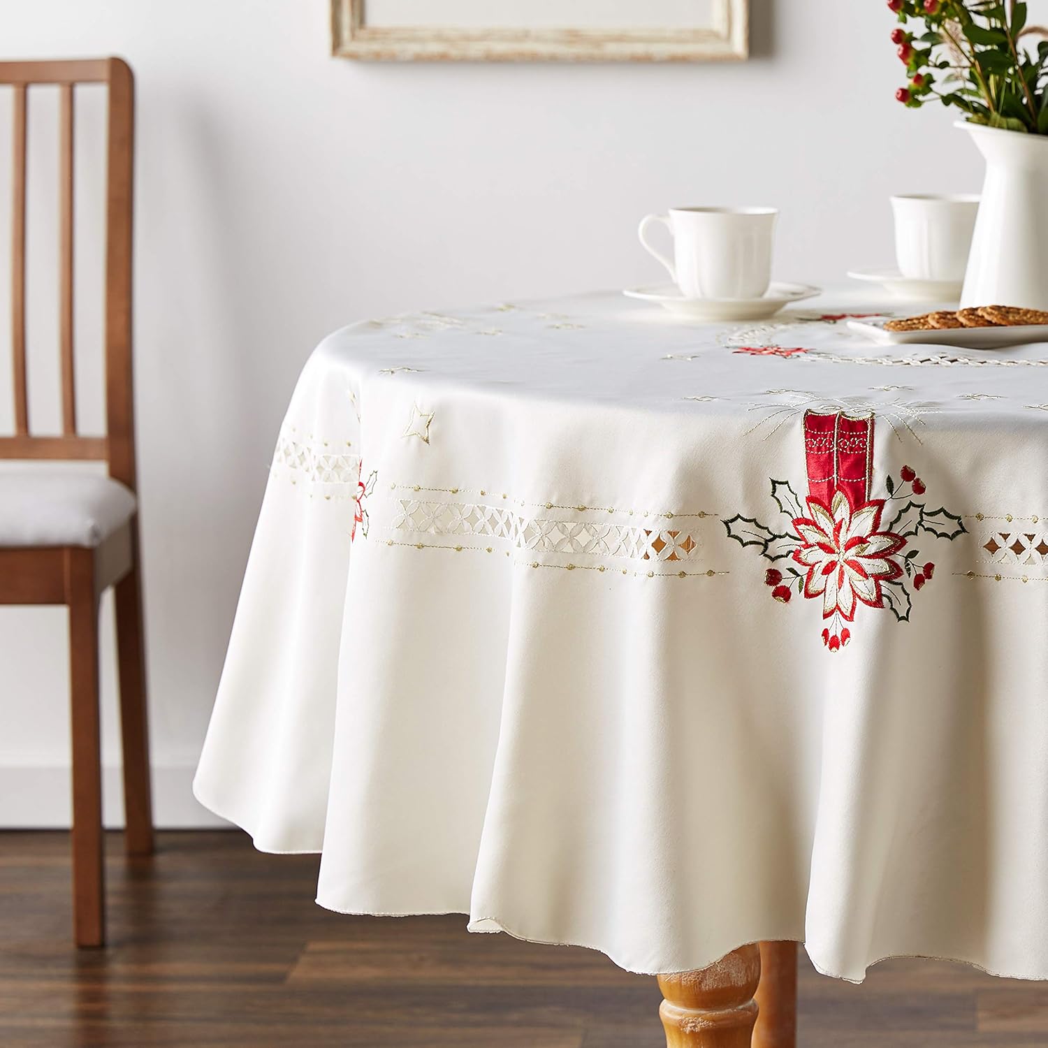 Seasonal Candles Vintage Holiday Embroidered Design Tablecloths- Beige - 70" Round