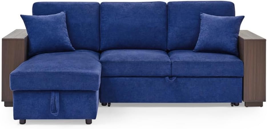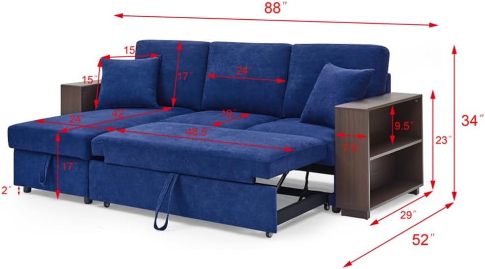 Blending classic and rustic elements, this sectional sofa includes 2 seatssofa with pulled out bed and reversible chaise with storage. It brings elegant to your living room and blending well with any home decor.The chaise adds a storage function to accommodate more items, and it can be interchangeable to meet the needs of different customers.Our sectional sofa is based on a solid hardwood frame with highdensity foam and spring package cushions built into linen, MDF armrest perfectly support the entire sofa and can be used for many years.There is a pulled out bed under the sofa for rest, it can be a twin size sleeper with minimal effort.Both two armrestsprovide shelf function for customers to place ornaments,and the inner height can be adjust easily from 7”to 19.5”MaterialUpholstery:LinenFrame: Eucalyptus wood+PlywoodSeat Fill:1.6 lbs./cu. ft. Foam+Spring packageLegs: 2inchSeat ConstructionSpring package+SpongeSize:As shownProducts included:1* sofa(no other presentation items included).Notice:1. Due to manual measurement, please allow 2-3% error, before you bid, please make sure you don't mind.2. The color may vary due to different displays, please refer to the actual product.