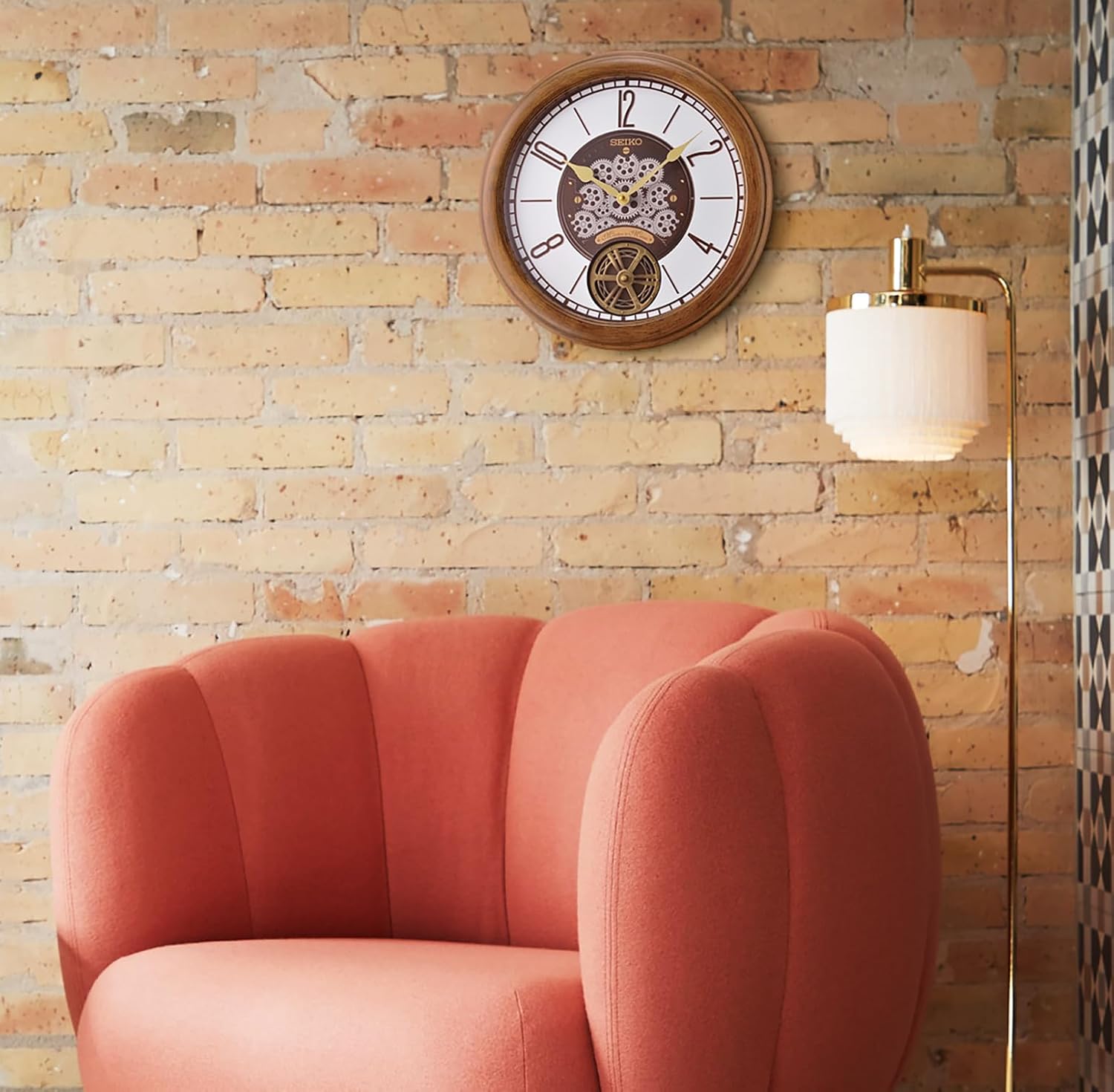 Introducing the Seiko Cogs and Gears Melodies in Motion Wall Clock – a captivating fusion of artistic design and musical innovation, reminiscent of the enchanting world of steampunk. Housed in a rich wooden brown case adorned with intricate cogs and gears, this clock exudes an air of vintage charm and mechanical elegance. Its Arabic numerals further enhance its steampunk aesthetic, adding to its unique appeal. But the Seiko Cogs and Gears is more than just a striking piece of decor – it's a symphony in motion. On the hour, the clock comes to life, playing one of 18 melodies that will transport you to another realm. And with a light sensor that intelligently disengages all melodies when darkness falls, you can enjoy peaceful nights without interruption. For those who appreciate the finer details, the clock features a demonstration button, allowing you to marvel at its intricate movements and melodies at any time. The one-way rotating pendulum adds a mesmerizing touch, further enhancing its visual spectacle. Powered by a combination of three AA and two C batteries (included), the Seiko Cogs and Gears ensures reliable performance without the need for constant maintenance. With overall dimensions of 14.76 x 14.74 x 2.91 inches, this clock makes a bold statement on any wall, commanding attention with its artistic flair and musical prowess. Immerse yourself in the enchanting world of steampunk with the Seiko Cogs and Gears Melodies in Motion Wall Clock – where artistry, melody, and innovation converge to create a truly mesmerizing timekeeping experience. All Seiko clocks are equipped with quartz movement making it the most accurate at time keeping. Perfect for tween to adult.