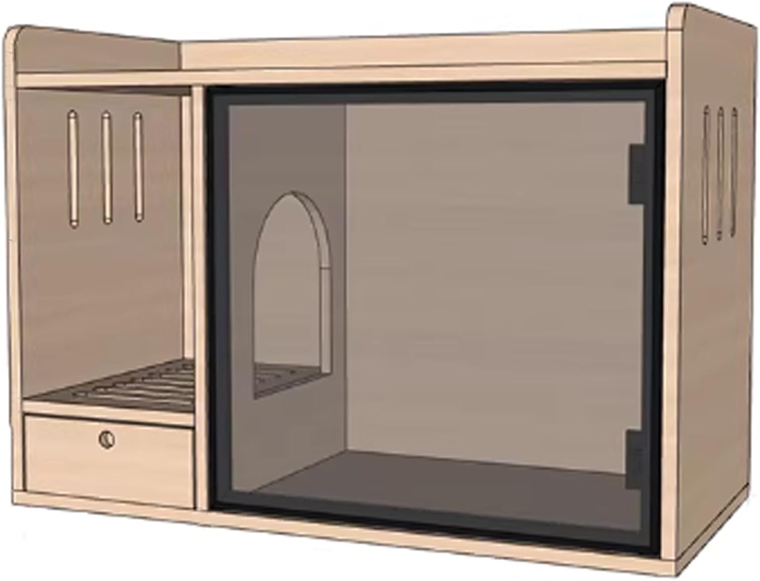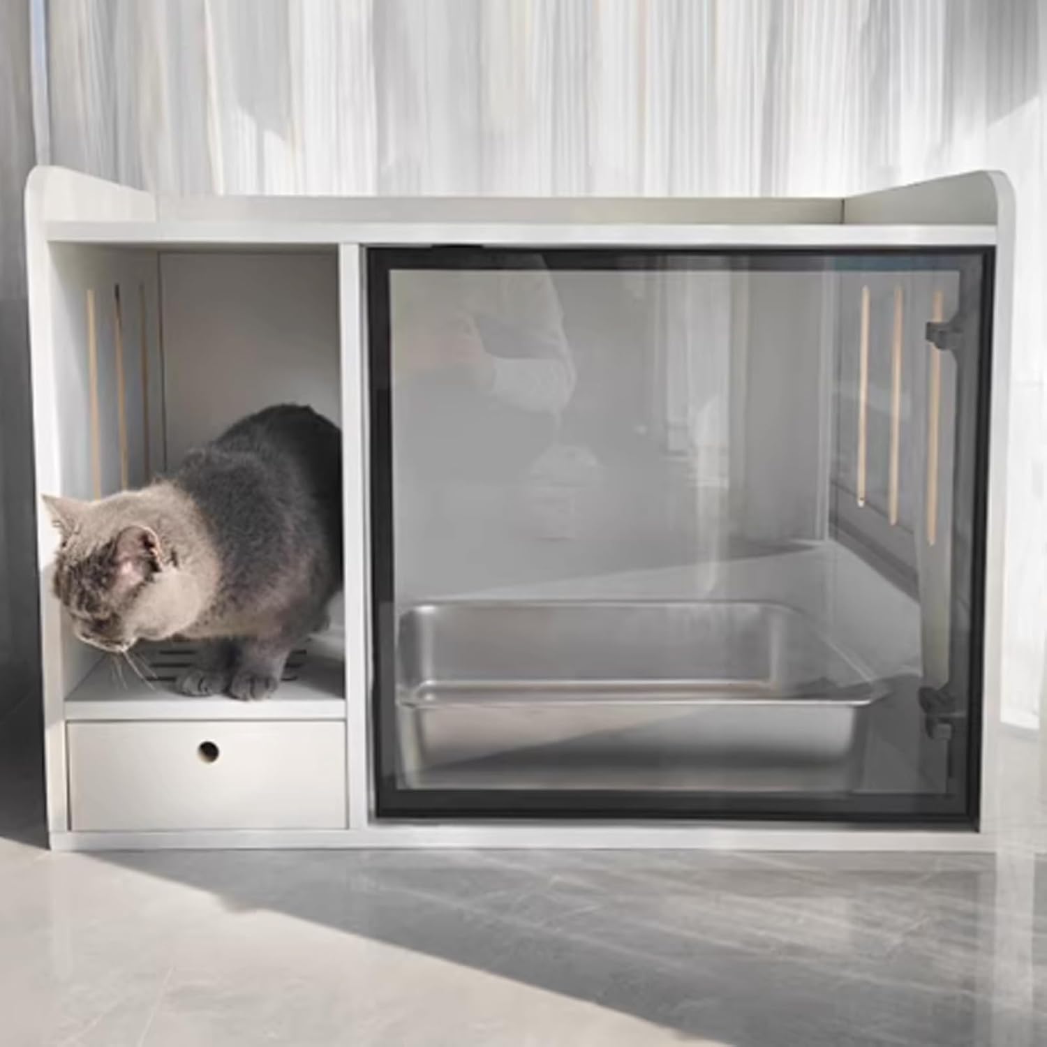 Spacious enough for most self-cleaning and standard litter boxes, YUGXTH enclosure creates a neat, organized, and functional area in any room.The litter drain and drawer automatically collect any litter that spills, reducing cleaning workload.The transparent door allows for easy observation of litter volume, and features convenient opening and closing with good sealing.Specifications:Product Name: Hidden Litter Box, Hidden Cat Litter Box Furniture, Cat Litter Box Enclosure Furniture, Hidden Litter Box FurnitureMaterial: Solid Wood Eco-board+tempered glassColor: Brown, Natural, WhiteLength: 85cm/33.4in, 95cm/37.4inWidth: 45cm/17.7inHeight: 60cm/23.6inSuitable litter box size for 85cm/33.4in model: 50*35*15CMSuitable litter box size for 95cm/37.4in model: 60*35*15CMApplicable Scene: Daily home useAssembly Required: YesPackage Includes:1 x Cat Litter Box CabinetPurchase Notes:1. The product you ordered is only the cat litter box cabinet and does not include the cat litter box.2. Due to factors such as lighting, shooting, and monitor settings, there may be differences between the picture and the actual product color. Please refer to the actual product.3. The dimensions of this product are measured manually, and there may be an error of 1-3 cm. Please refer to the actual product for specific dimensions.