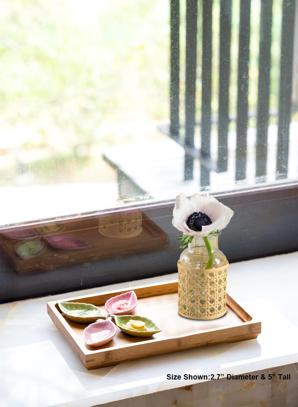 Bring natural warmth to your space with this clear glass vase wrapped in handwoven rattan, offering an inviting blend of texture and simplicity. Its versatile size makes it perfect for displaying a single stem, seasonal blooms, or standing alone as a casual decorative accent. The artisan cane detailing lends boho and coastal charm, seamlessly fitting into relaxed, earthy interiors. Whether styled solo or grouped in multiples, it adds effortless elegance to tabletops, shelves, or centerpieces. The vase measures 2.7" Diameter and stands 5" Tall.