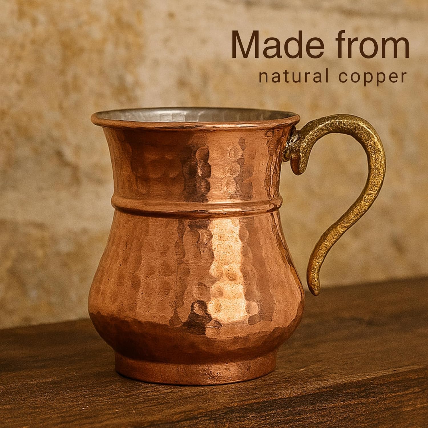 -Our products are hand-forged and produced by the coppersmiths of Kahramanmaraş. -The exterior of our copper products is polished to prevent tarnishing, and the interior is coated with tin using traditional methods. -They are long-lasting and durable. -They do not rust. -The visible and distinctive lines on our products are due to the fact that each product is individually handcrafted; therefore, each product's lines are unique. -Our copper products are not factory-made and are 100% handmade. *Height: 10 cm *Thickness: 0.7 mm *Weight: 160 g *Volume: 250 ml *Package Contents: 1 Copper Strand Mug -Due to its natural structure, copper can lose its shine with use. To restore its shine, wipe it with a cloth soaked in vinegar or rub it with lemon and salt. This will restore your copper products to their former shine. 1- Before first use, hand wash the product with warm soapy water and dry thoroughly. 2- Do not wash in the dishwasher. 3- Do not use a wire brush or bleach. 4- Always dry after each wash.