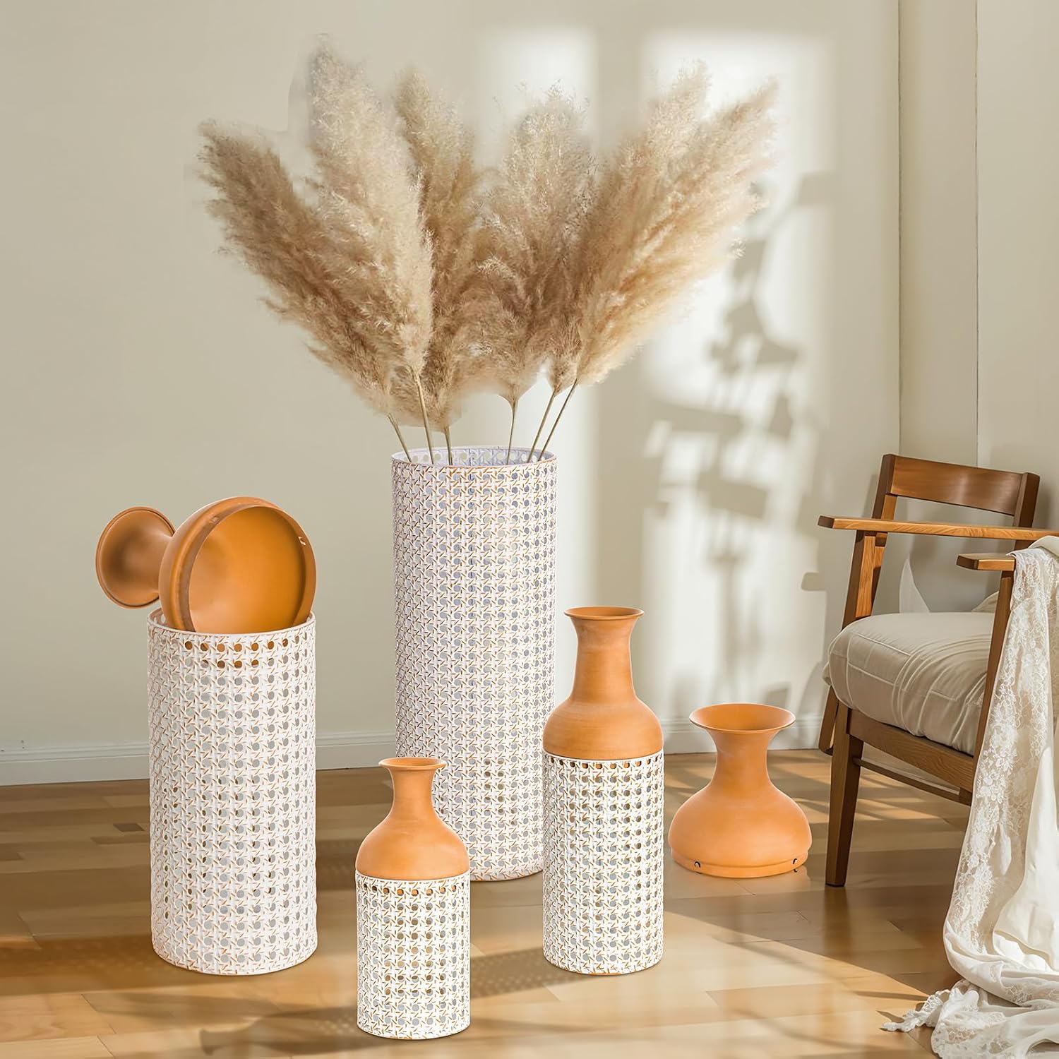 Four Large Metal Floor Vases with Lids The extra large floor vase featured white bottle body and yellow lid. With matte finish and woven pattern openwork design, looks elegant and classic. Stable and Durable Tall Vase: The bottom of the vase is widened to ensure stability and not easy to tip over. After anti-rust and anti-corrosion treatment, for long-term use. Kindly Note: It’s not recommended to hold water. Wildly Use: These tall floor vases are not only suitable for placing fresh flowers, dry flowers and branch, reeds, artificial flowers and plants, but also can be used as an independent decoration to add an artistic atmosphere feeling. Suitalbe for Anywhere Indoors: Beautiful displayed on its own or placed with dried floral arrangements at anywhere indoors. It is an eye-catching accent piece of art in your bedroom, living room, kitchen, bathroom, entryway, etc. In addition, it's also great for wedding, party decor or a heartwarming gift for your family or friend. Package included: 4* Large Metal Vases with Lids